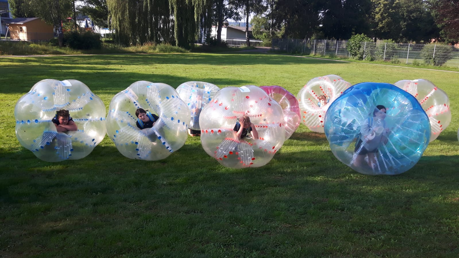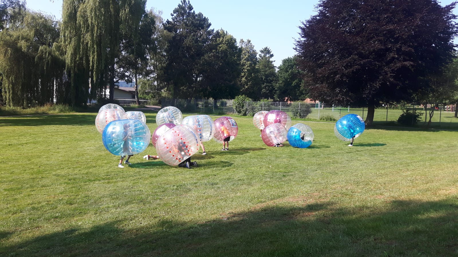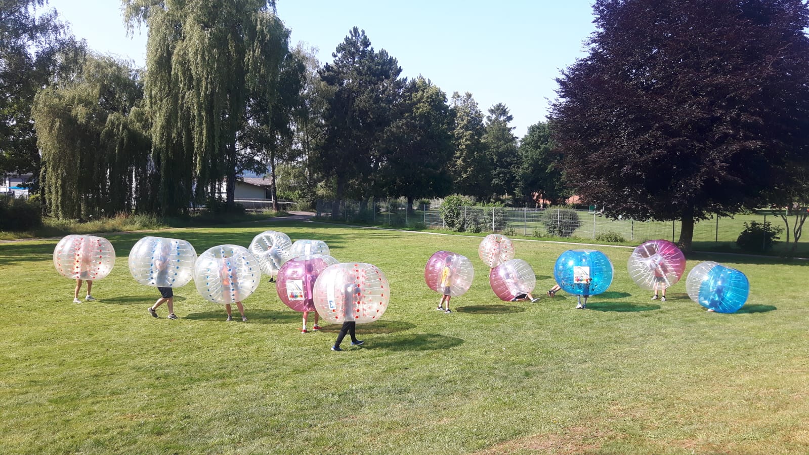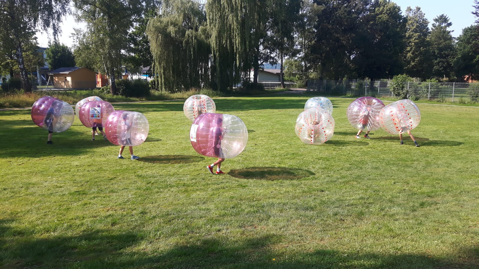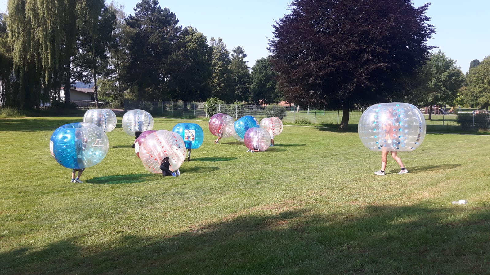 stecken alle Spieler in einem riesengroßen Ballon und versuchen, in zwei Teams gegeneinander zu spielen. Lustige Purzelbäume und hilflos auf dem Rücken liegende Spieler sind fast bei jedem Kontakt, ob mit Mit- oder Gegenspielern, vorprogrammiert - und damit jede Menge Spaß und Action.