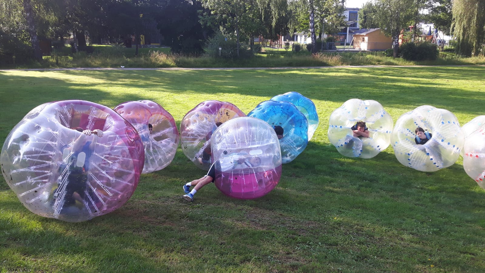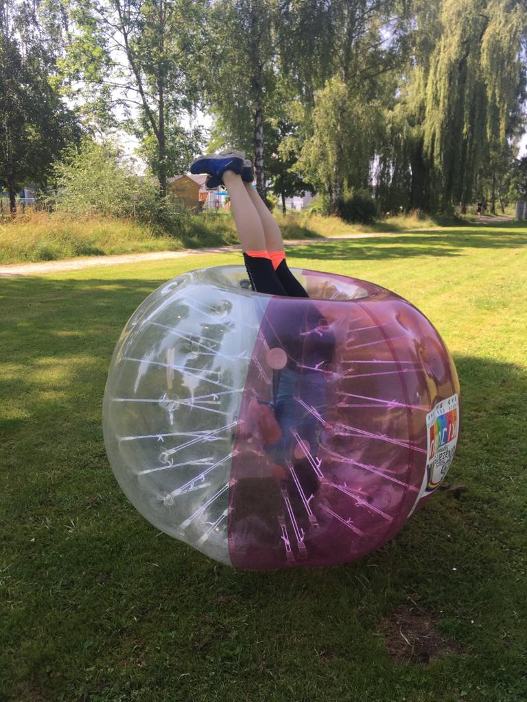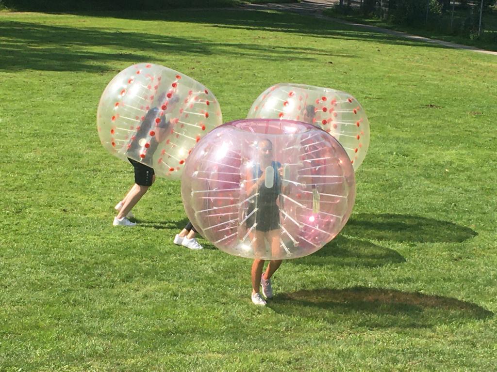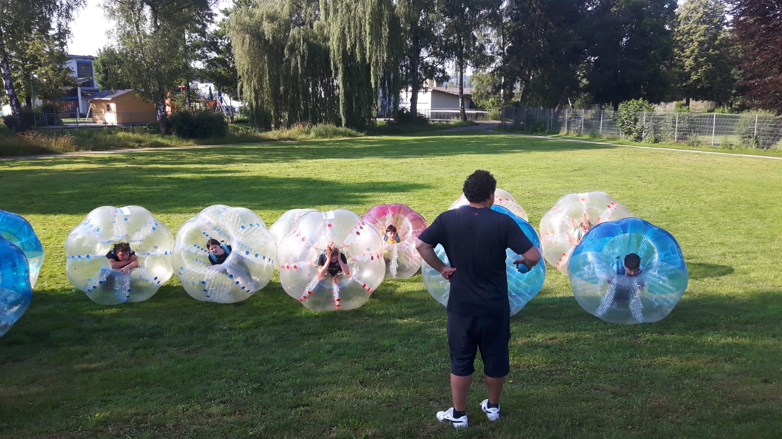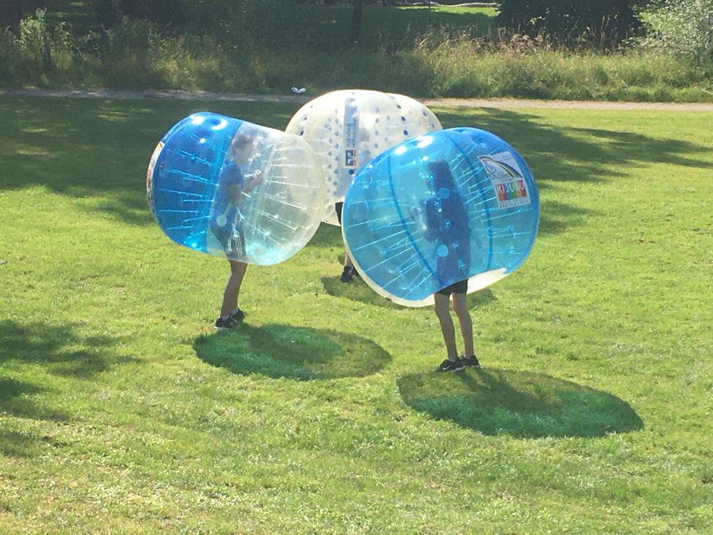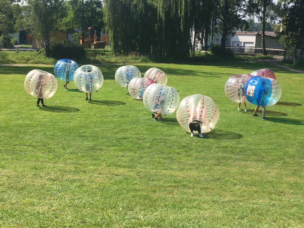 stecken alle Spieler in einem riesengroßen Ballon und versuchen, in zwei Teams gegeneinander zu spielen. Lustige Purzelbäume und hilflos auf dem Rücken liegende Spieler sind fast bei jedem Kontakt, ob mit Mit- oder Gegenspielern, vorprogrammiert - und damit jede Menge Spaß und Action.