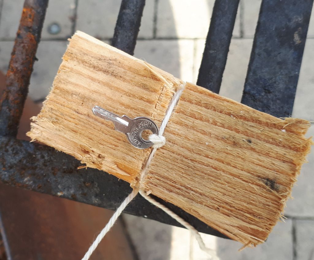 ... und der Schlüssel festgezurrt. Mit viel Glück schwimmt er bis ins Schwarze Meer.