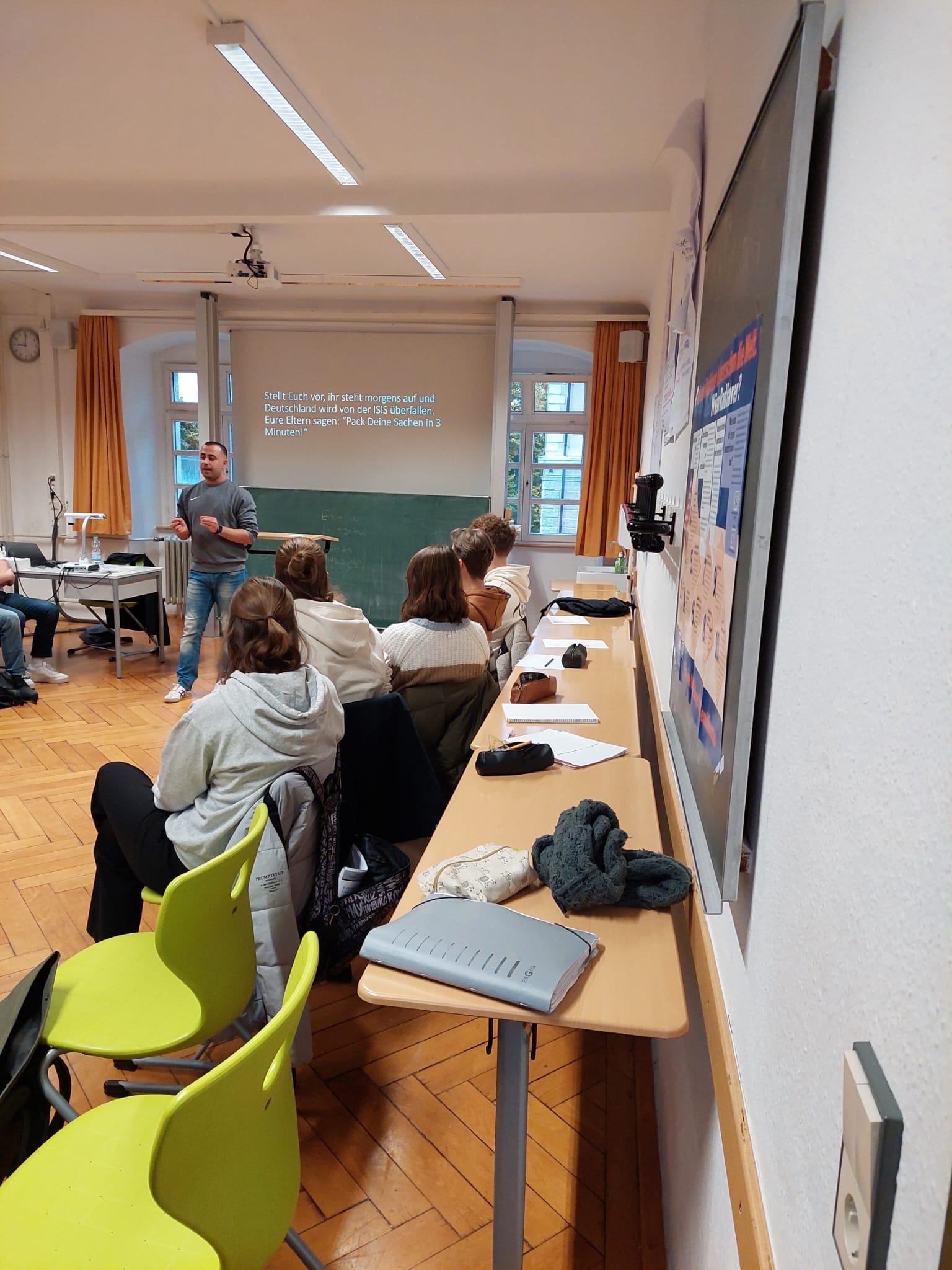 In der Modulwoche kam Noori Mato ans Gymnasium Mengen und erzählte der Jahrgangsstufe 1 von seinen eigenen Fluchterfahrungen und die Integration in Deutschland.