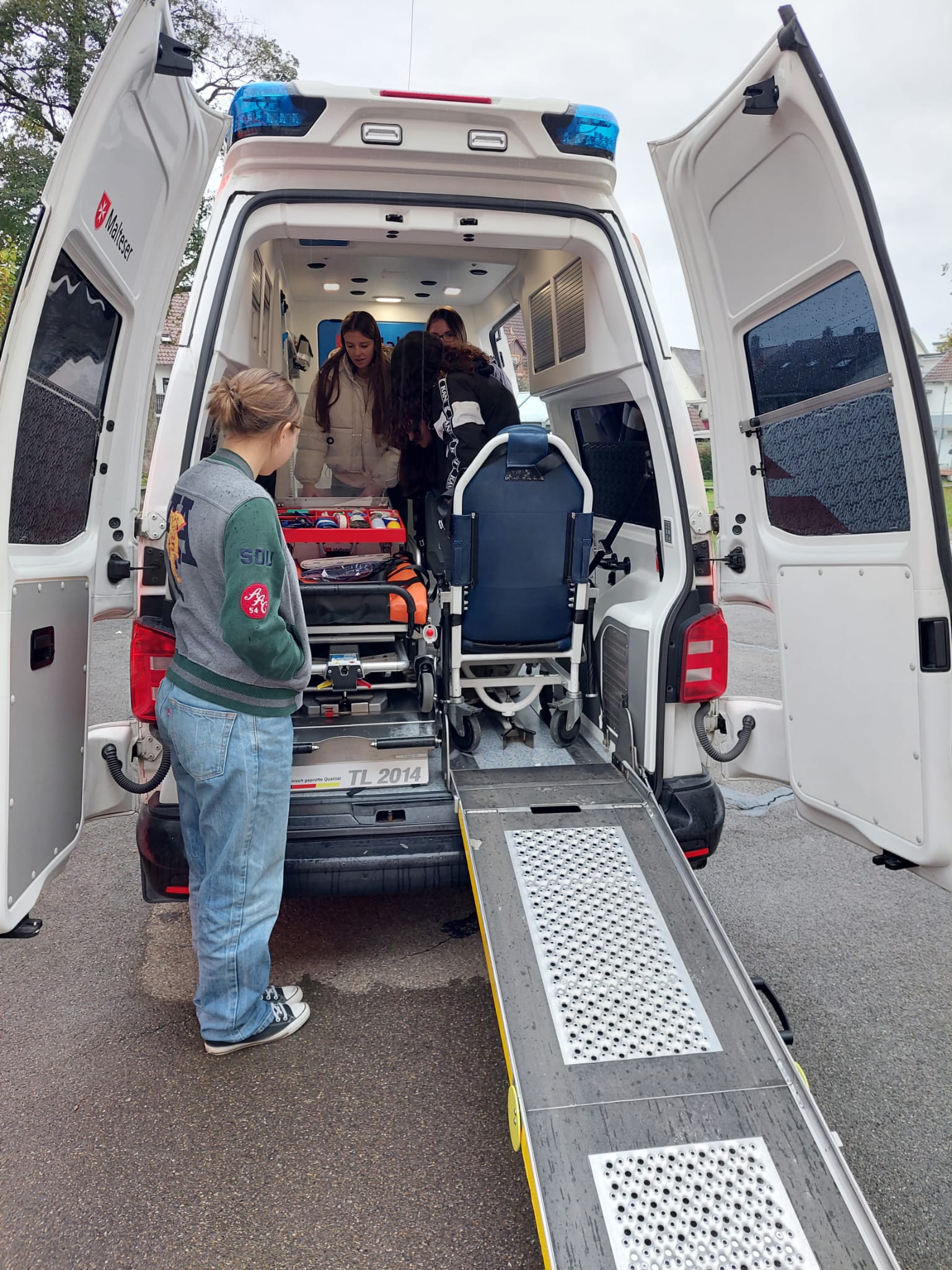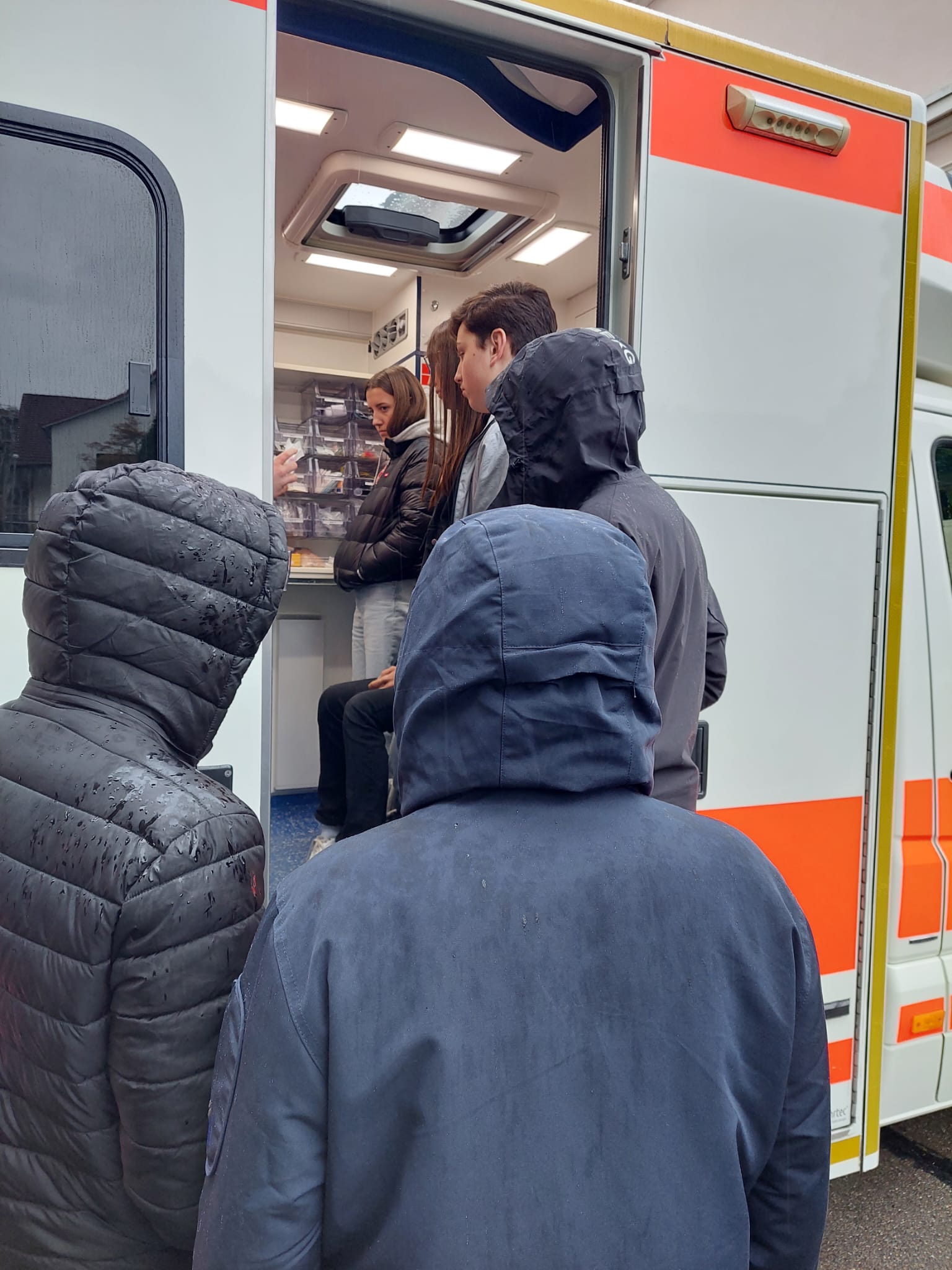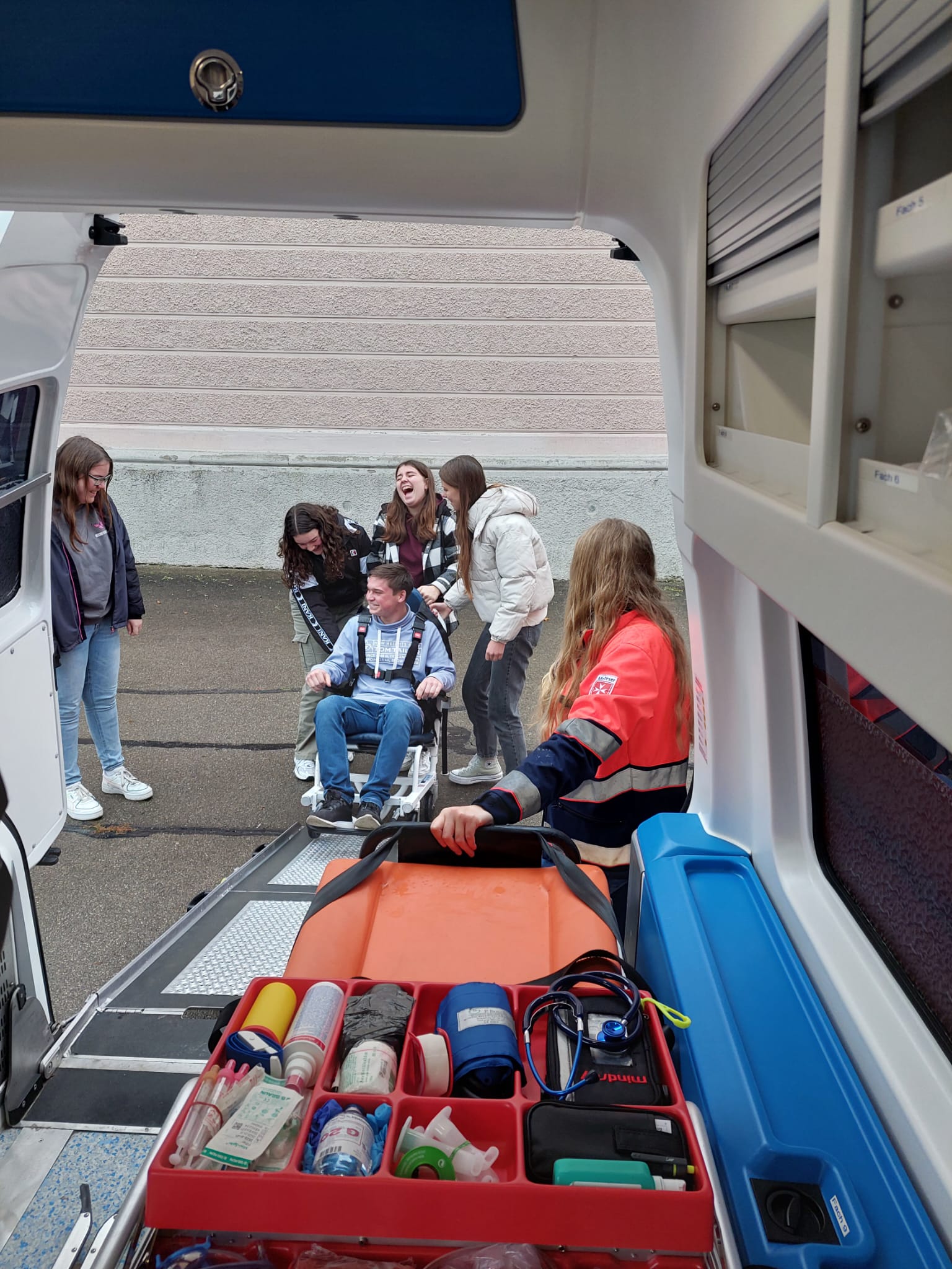 Nach dem kurzen Vortrag konnten wir in die Praxis übergehen. Die beiden Malteser hatten zwei Fahrzeuge mitgebracht, einen für Krankentransporte und einen Rettungswagen. Nach Lust und Laune durften alle Schubladen geöffnet werden und einige durften sich auch mal auf die Krankenliege legen. Andere halfen dabei, die „Verletzten“ im Schulhof herumzuschieben und die Liege wieder fest im Wagen zu montieren.