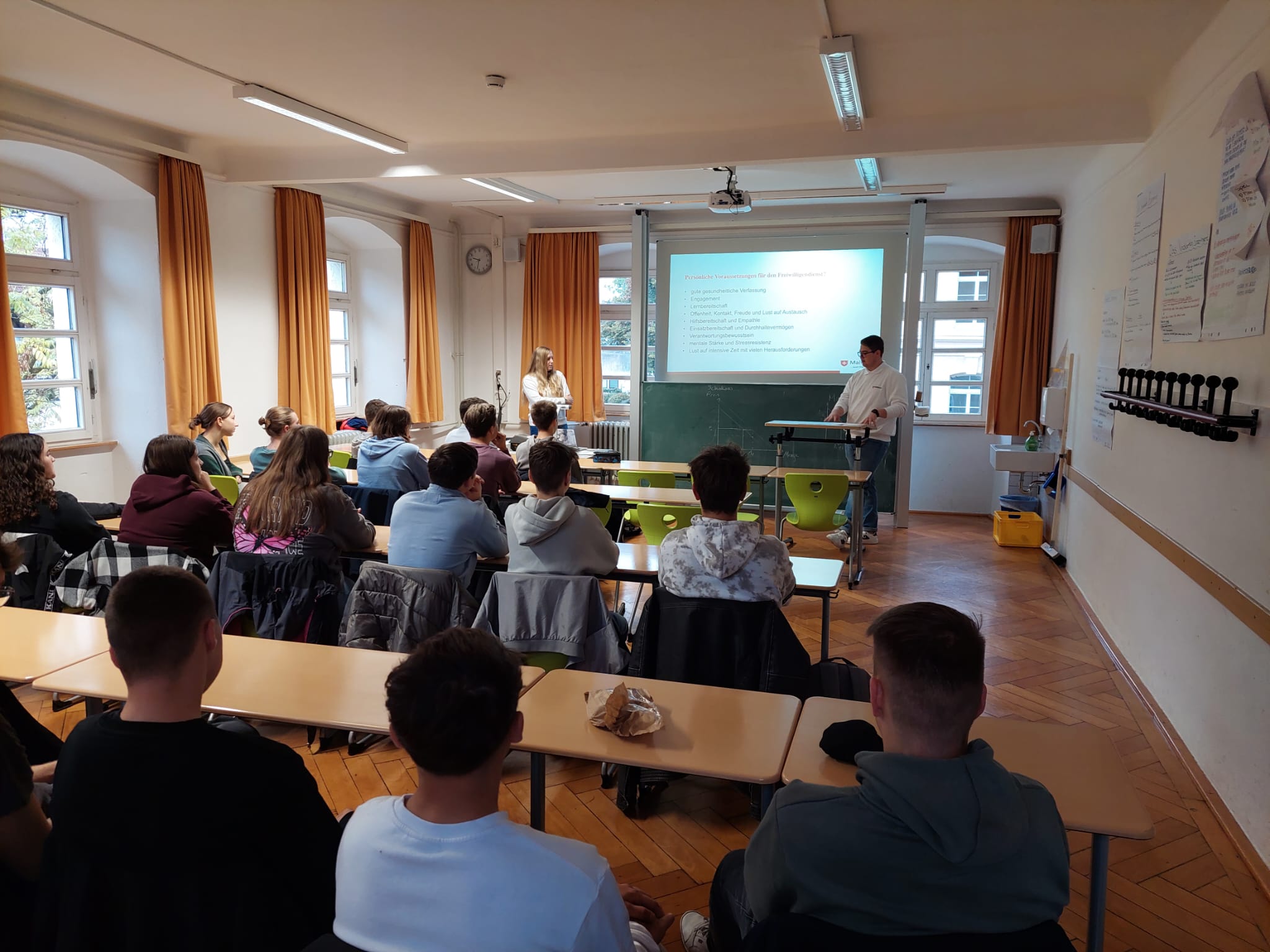 Frau Lena Renner und ihr Team-Kollege berichteten von ihrer beruflichen Laufbahn bei den Maltesern und von Möglichkeiten, dort ein FSJ oder BFD durchzuführen. Sie erzählten auch von spektakulären Einsätzen, wie z.B. dem brennenden Reifenlager in Gammertingen.