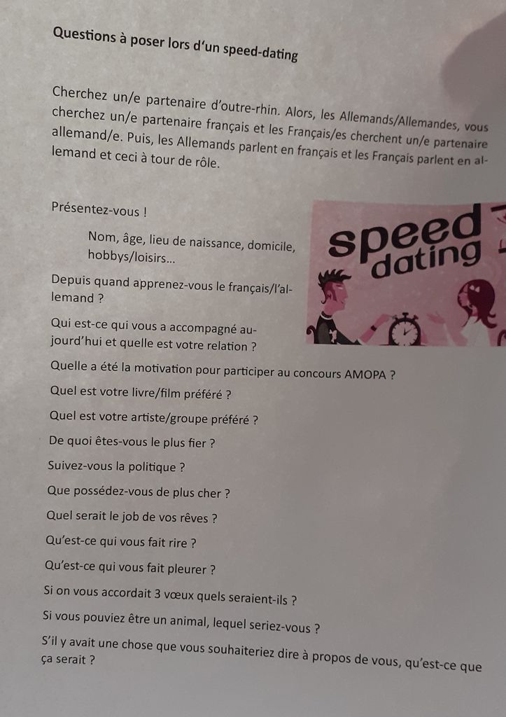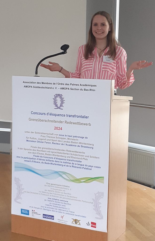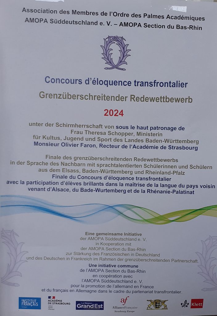 Alljährlich veranstaltet der Verband AMOPA zur Förderung der französischen und deutschen Sprache einen grenzüberschreitenden Redewettbewerb zu einem vorgegebenen Thema. Oberstufenschülerinnen und -schüler aus ganz Baden-Württemberg, dem südlichen Rheinland-Pfalz und dem elsässischen Departement Bas-Rhin sind aufgefordert, eine Rede in der Sprache des Nachbarn zu verfassen. Die süddeutschen und elsässischen Verbandsmitglieder gehören zum französischen Orden „Palmes Académiques“, der sich für besondere Verdienste im Bildungswesen einsetzt.