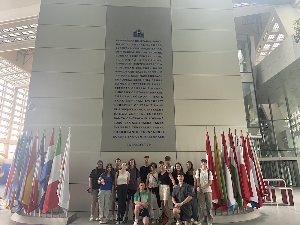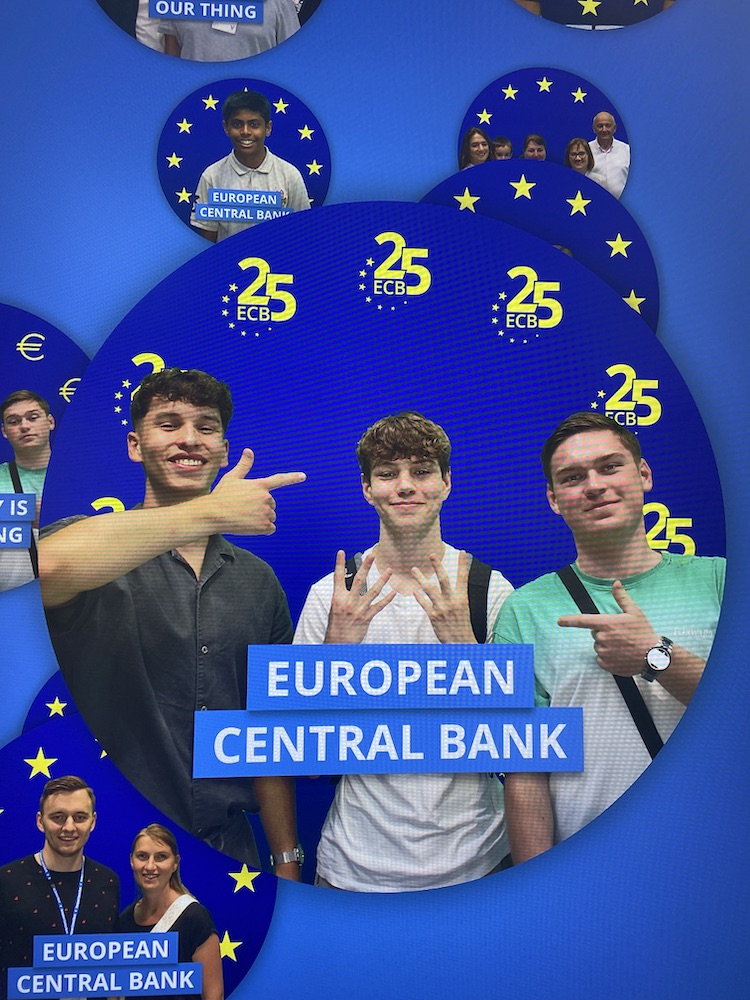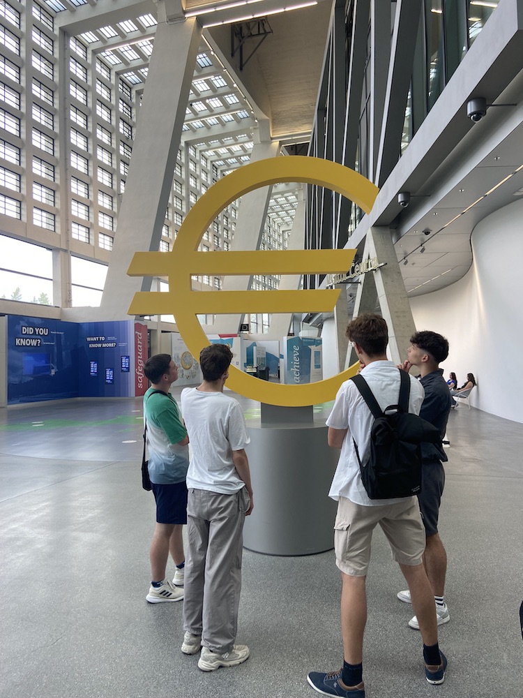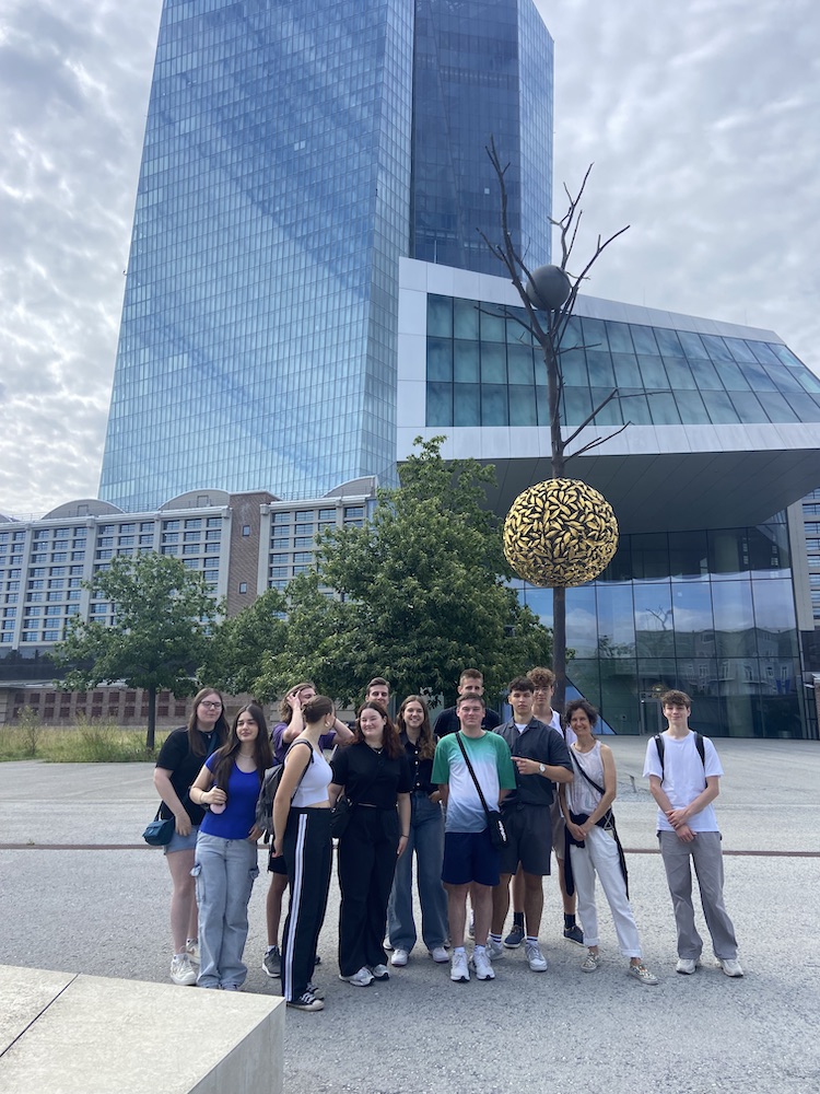 Nach einem interessanten Durchgang durch das Geldmuseum erhielt die Klasse von einem dortigen Mitarbeiter einen Vortrag zur Inflation und Deflation, bei dem wir einen guten Einblick in die Arbeit der deutschen Bundesbank bekommen haben. Danach haben wir die Unterkunft im berühmten Offenbach bezogen, eine Leckerei verspeist und den Abend entspannt auf unserer großzügigen Dachterasse ausklingen lassen. Der nächste Morgen fing mit einem vielfältigen und gesunden Frühstück an, bevor wir dann zur Europäischen Zentralbank aufgebrochen sind. Als wir die EZB betraten, verließen wir das deutsche Land und betraten europäisches Terrain und bekamen von einer Mitarbeiten eine Führung durch die EZB. Wir erfuhren, welche Aufgaben sie zu erfüllen hat und welche Verantwortungen sie trägt, um den Euro stabil zu halten. Im Anschluss begaben wir uns auf eine Zeitreise, indem wir einen Blick in die berühmte Paulskirche warfen, in der 1848 die erste deutsche Demokratie diskutiert wurde.