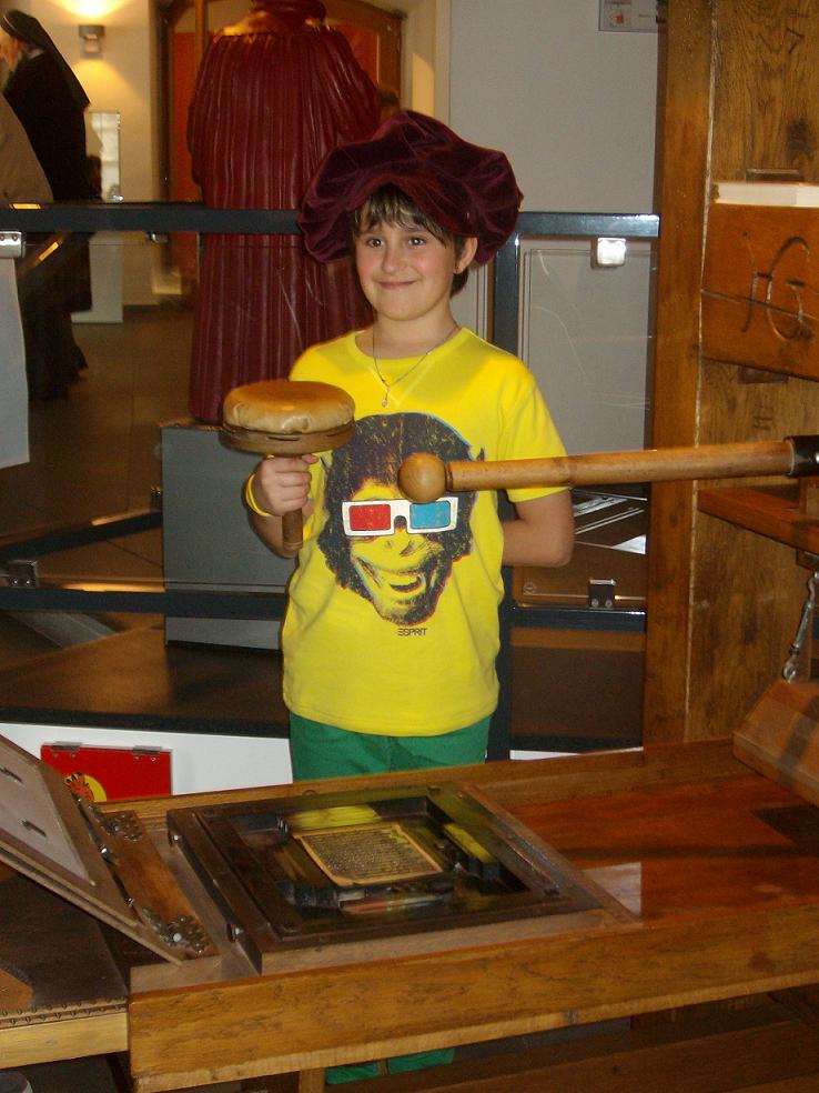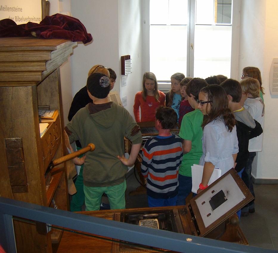 Bei der Druckerpresse bestaunten wir die verschiedenen Metallbuchstaben, jeder, der wollte durfte jetzt selbst beim Druck helfen, es war der Psalm 23 „Der Herr ist mein Hirte“. Die Druckerschwärze besteht aus Ruß und Pech, das ergibt das schwärzeste Schwarz!