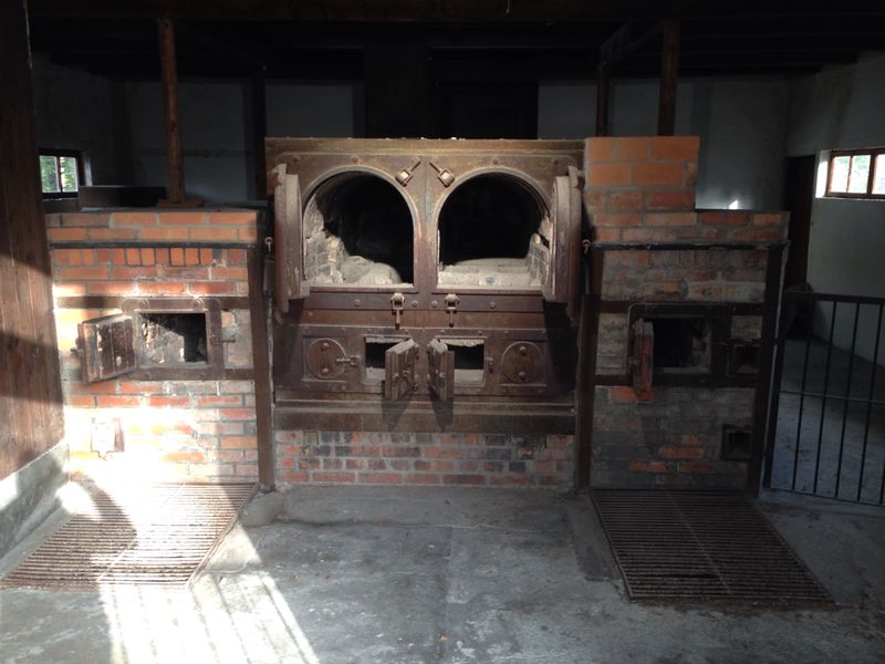Über einen Graben und vorbei an großen Zäunen, die dazu dienten, die Flucht der Gefangenen unmöglich zu machen, liefen wir Richtung Krematorium. Im Krematoriumsbereich stehen zwei Hütten, eine kleinere und eine größere. Die kleine beherbergt zwei Öfen zur Verbrennung der Toten.