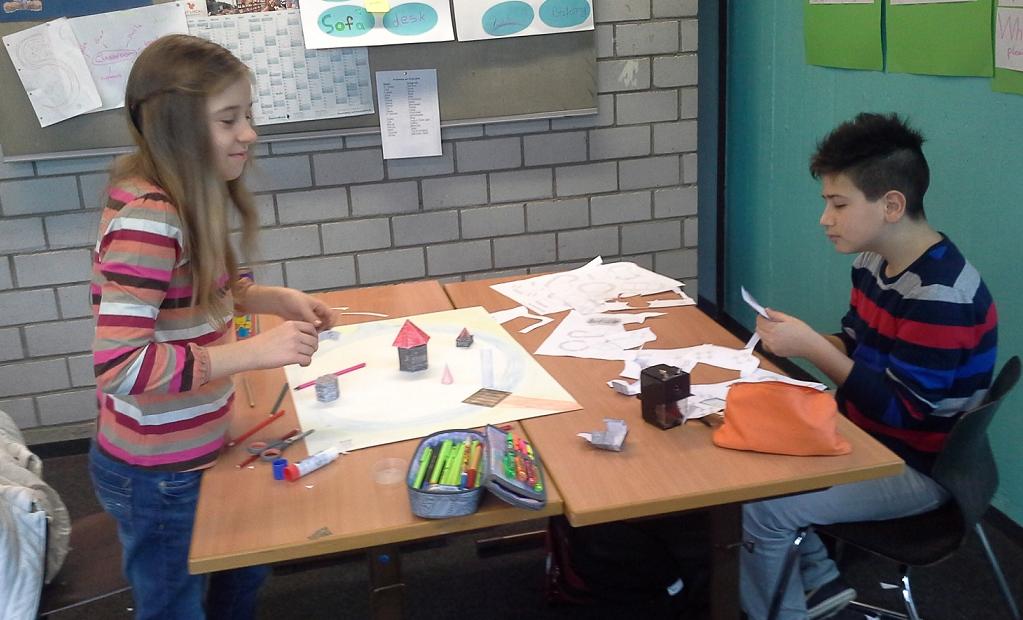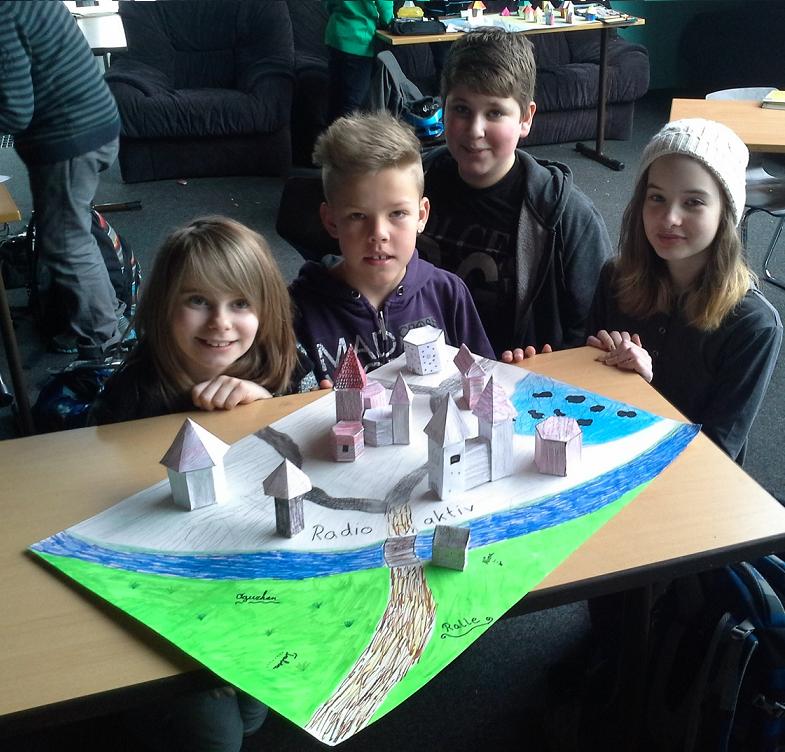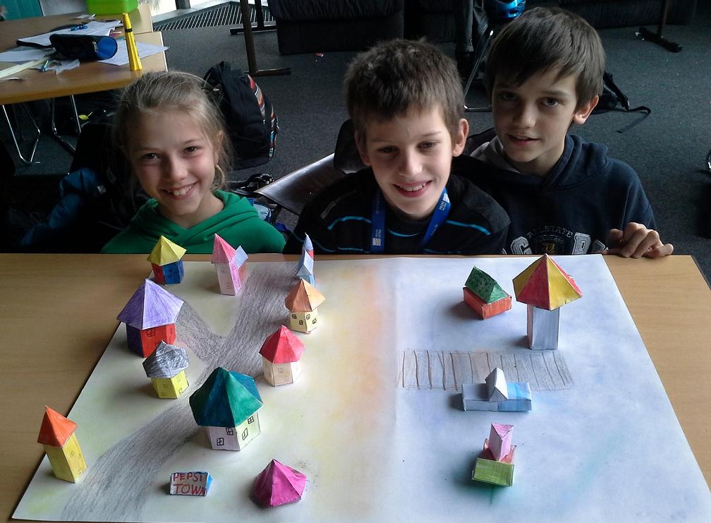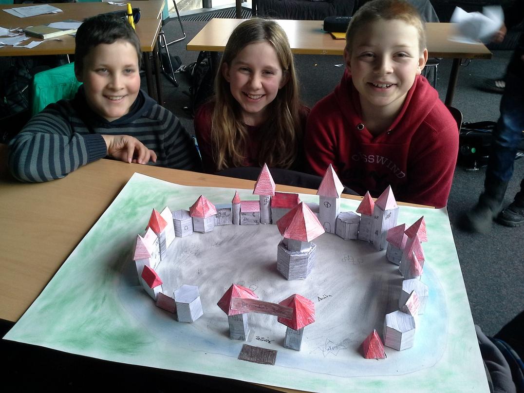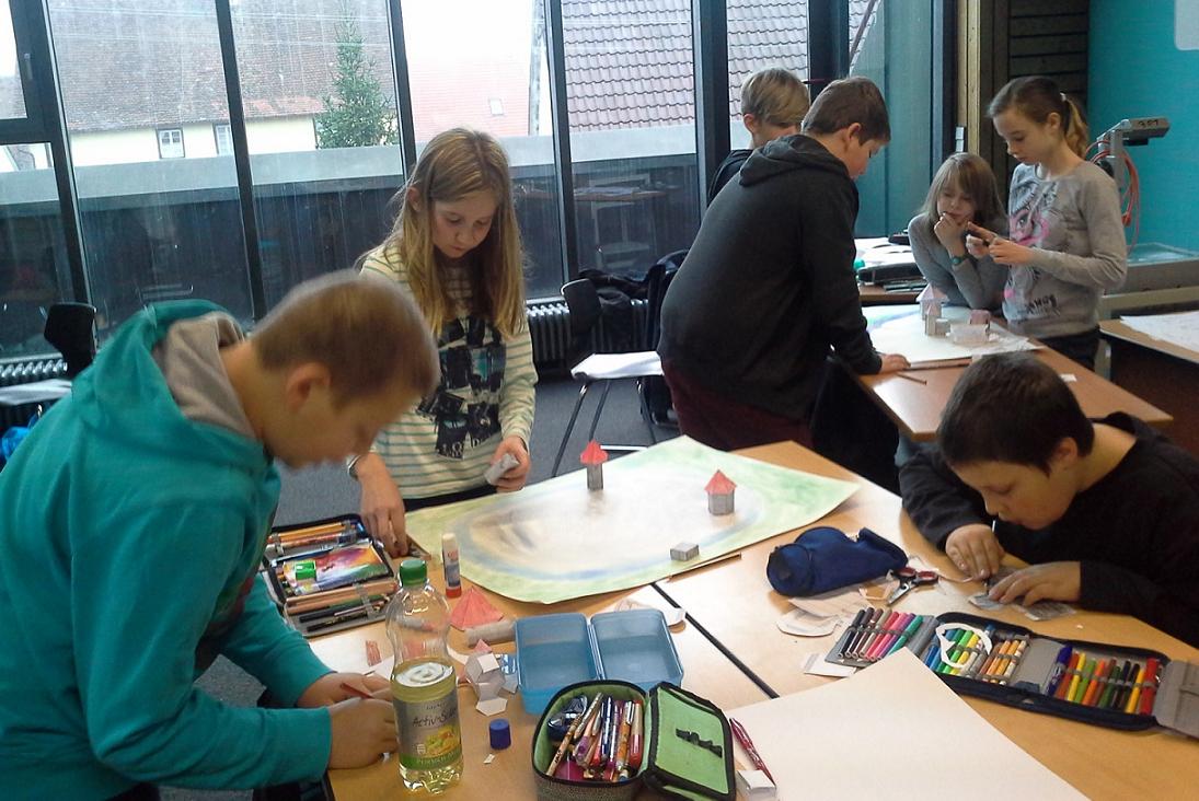 Dass Mathematik keineswegs nur graue Theorie ist, erlebten im Februar die Schüler der Klasse 5a: Angeleitet von ihrer Mathematiklehrerin Frau Schmid bauten sie aus geometrischen Körpern, deren Netze sie selbst bemalt und zusammengebastelt hatten, fantasievolle Geometrie-Dörfer zusammen. Die Ergebnisse waren so gelungen,