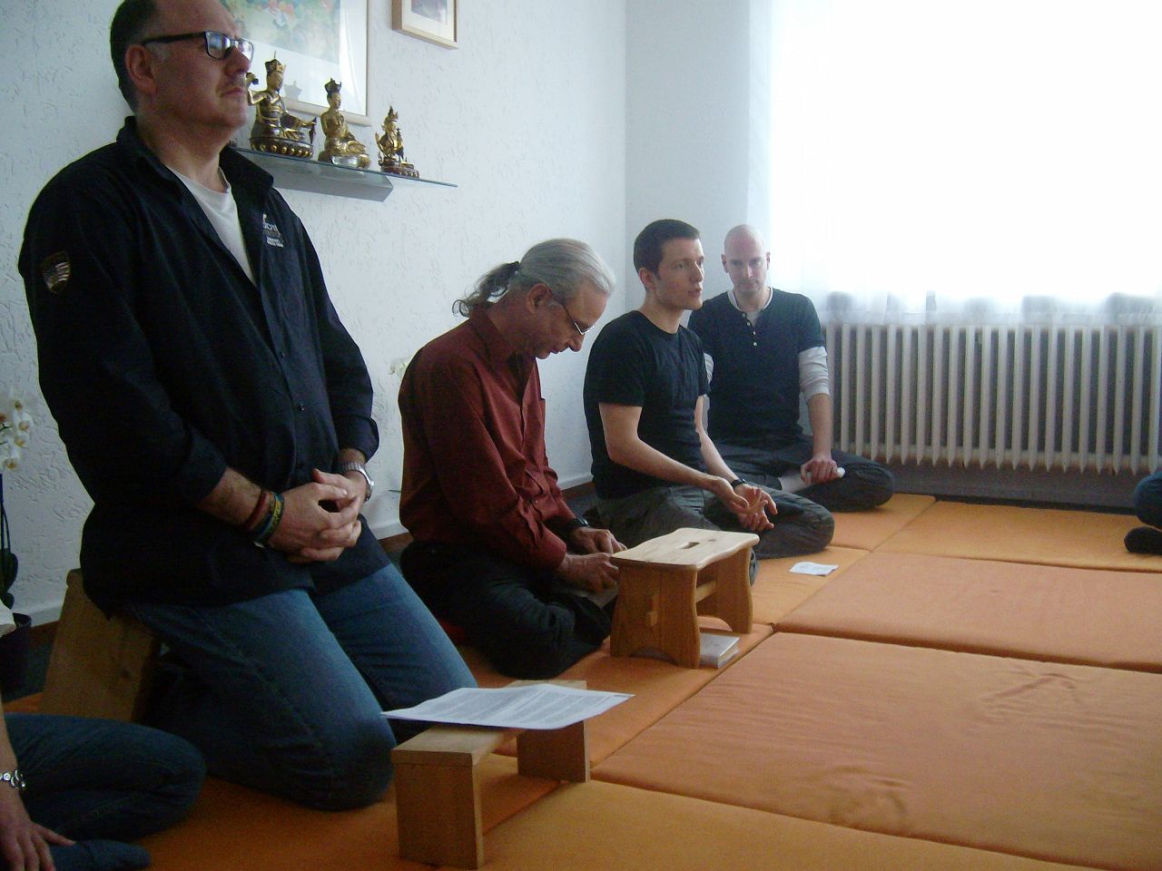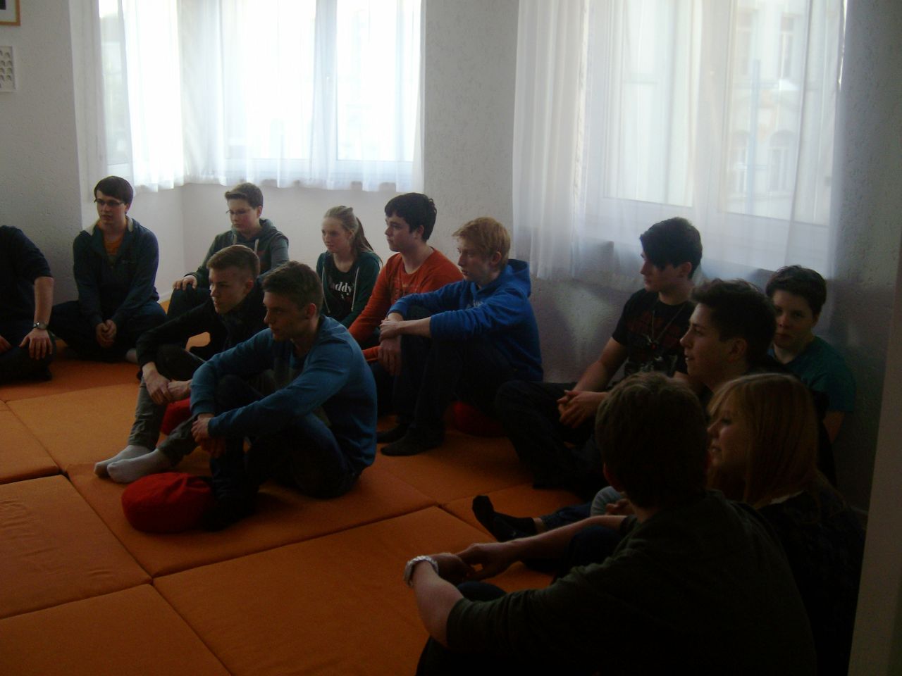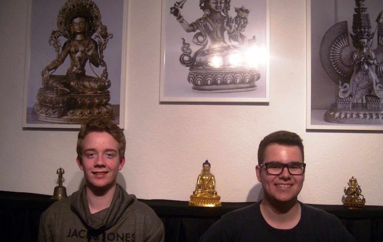 Vor dem Besuch hatten wir Zeit, in kleinen Gruppen die Innenstadt Ulms unsicher zu machen, bis wir uns gegen 16.30 Uhr wieder trafen, um gemeinsam ins nahe gelegene Zentrum zu gehen. Dort wurden wir offen und freudig empfangen. Zuerst wurden wir gebeten unsere Schuhe auszuziehen, da dies in der Weltreligion so üblich ist. Anschließend durfte sich jeder ein mit Sand gefülltes Sitzkissen nehmen und sich im Schneidersitz darauf setzen, um nun den sechs gut informierten Buddhisten zuzuhören. Eigentlich hatten sich die meisten von uns einen typischen buddhistischen Mönch mit Glatze, langen farbigen Gewändern und unverständlichen Gebeten als Gastgeber vorgestellt. Ganz entgegen unseren Erwartungen saßen uns jedoch sechs unauffällige und herkömmlich gekleidete, im Leben stehende Personen gegenüber, welche uns ausführlich über ihre Religion informierten, aufmerksam unseren Fragen lauschten und uns aussagekräftige Antworten lieferten.