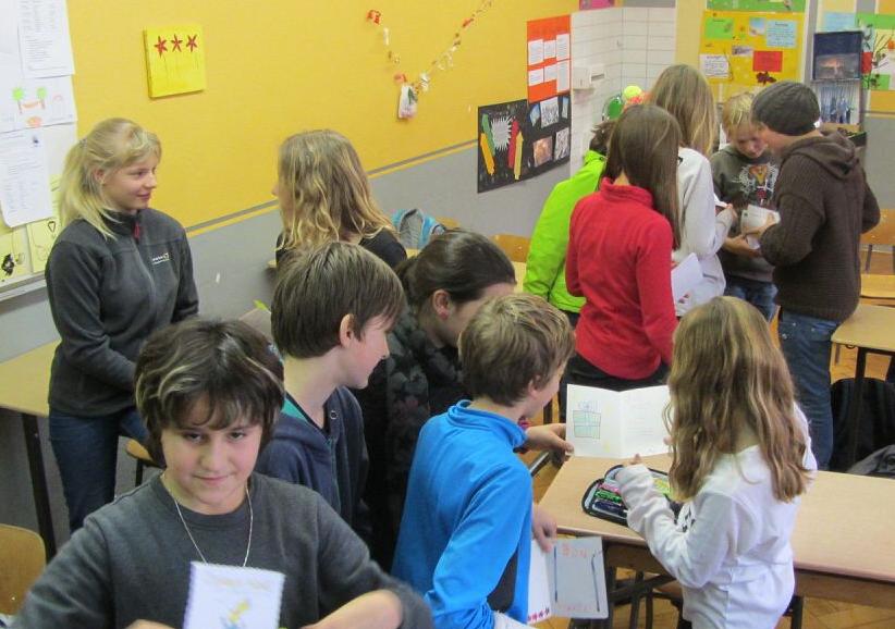 Die Freude über die unerwartete Einladung zum Austausch war groß, und so testeten alle Sechstklässler sogleich aus, was man nach etwa 15 Wochen Französisch-Unterricht schon alles sagen kann. Die gesammelten Briefe sind inzwischen längst auf dem Postweg, aber bald sollen auch noch zwei Päckchen folgen: Die 6a bereitet eines für die Fasnet vor, die in der Auvergne weitgehend unbekannt ist, und die 6b will in ihrem Päckchen wenige Wochen später die deutschen Bräuche zu Ostern vorstellen.