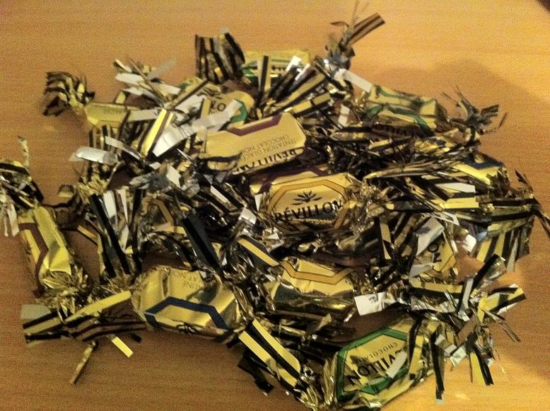 Die berühmten "papillotes" sind eine Spezialität aus Lyon: ein Stück Schokolade, eingewickelt in ein Papier mit Text / Botschaft (heutzutage in der Regel ein kluger Ausspruch oder ein Zitat) und anschließend eingehüllt in goldenes oder silberfarbenes Bonbonpapier.