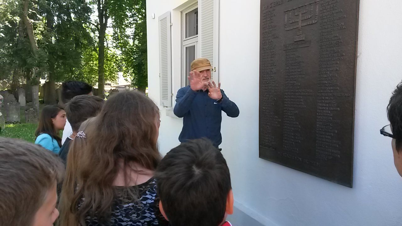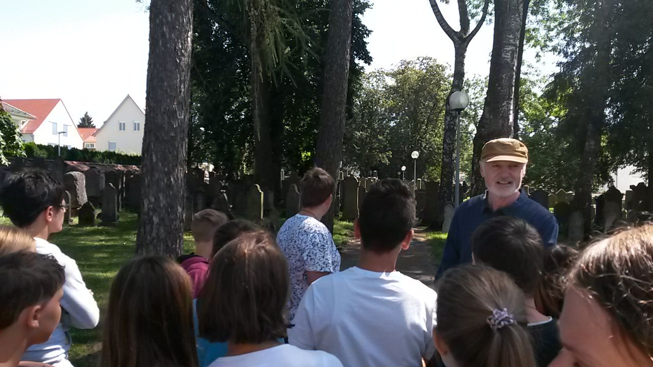 Nun wurden die Gruppen getauscht und wir gingen auf den jüdischen Friedhof. Als wir in den Friedhof eintraten, sahen wir eine Tafel, auf der viele Namen standen; wir erfuhren, dass die Nazis die Juden nicht „nur“ töten, sondern auch ihre Namen und damit ihre Existenz auslöschen wollten. Letzteres schafften sie aber nicht, denn die Tafel zeigt, wie viele Juden damals in Laupheim gelebt haben und wie sie hießen.