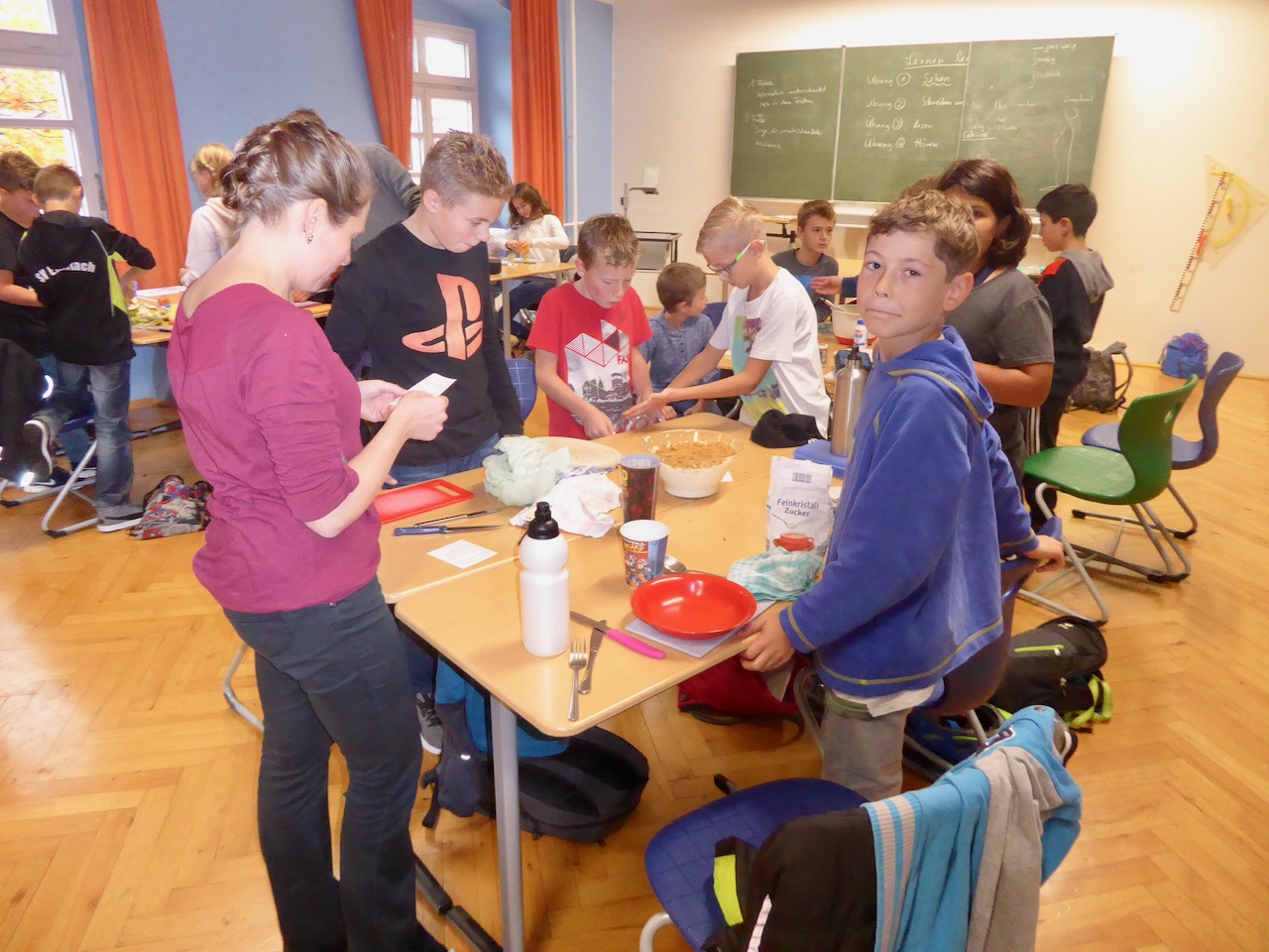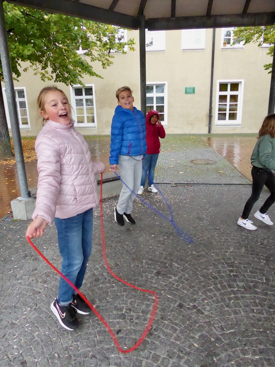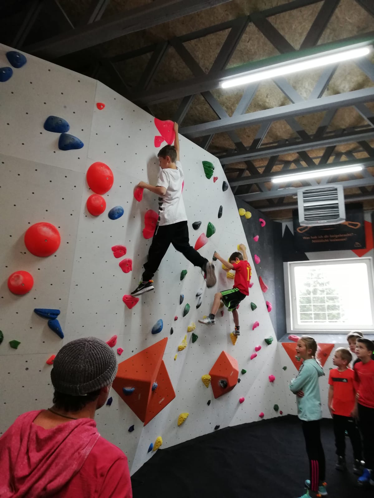 . Dabei sollten die Kinder die drei Meter hohe Wand erklimmen und von dort Dosen mit Sandkissen abwerfen. Was zuerst leicht aussah, war in Wahrheit für viele (auch die Lehrkraft) schwer durchzuführen. Doch dies war nicht die einzige Hürde, die es zu meistern galt. Auch bei vielen anderen Spielen kamen wir ins Schwitzen, wie z. B. die Glöckchen an den Füßen, mit denen man besonders leise klettern musste, oder das Partnerklettern, bei dem zwei Personen durch ein Band miteinander verbunden waren und so die Wand erklimmen mussten. Dabei konnten die Kinder nicht nur ihre sportlichen Fähigkeiten ausbauen, sondern die Freundschaft untereinander stärken, denn es ging auch darum sein Team anzufeuern oder sich gegenseitig Tipps zu geben.