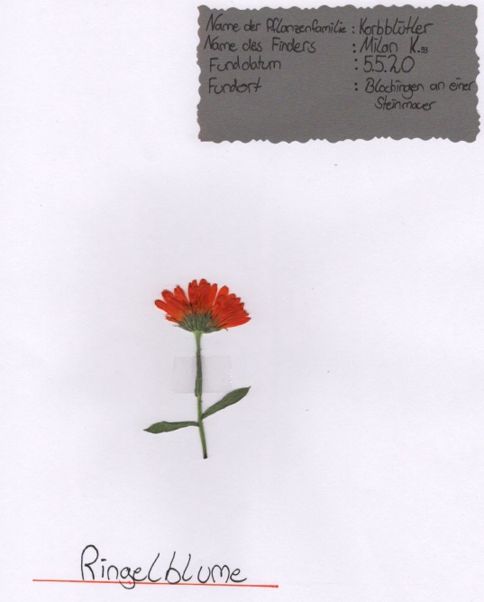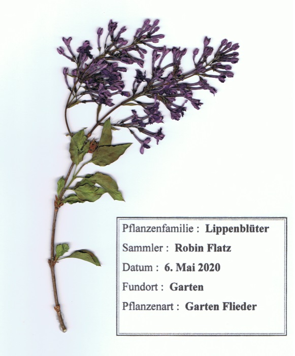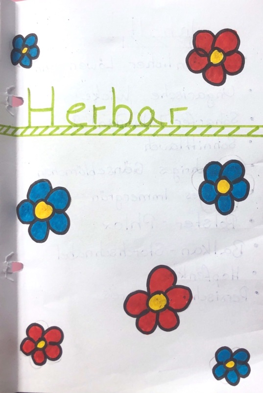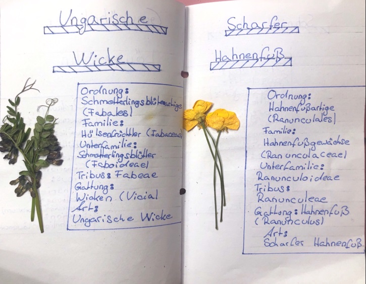Zuerst sammelten die Schüle bei einem Streifzug durch Wald und Wiesen verschiedene Blütenpflanzen. Anschließend untersuchten sie diese zu Hause genau und ordneten sie anhand ihrer Merkmale den bereits kennengelernten Familien zu. Mit Hilfe einer App und von Fotos der einzelnen Pflanzenteile konnten auch noch die Namen der Pflanzenarten herausgefunden werden. Anschließend trockneten und pressten die Schüler ihre Pflanzen vorsichtig. Zum Schluss erstellten sie zu jeder Pflanze mit einem passenden Etikett eine Seite für ihr Herbar.