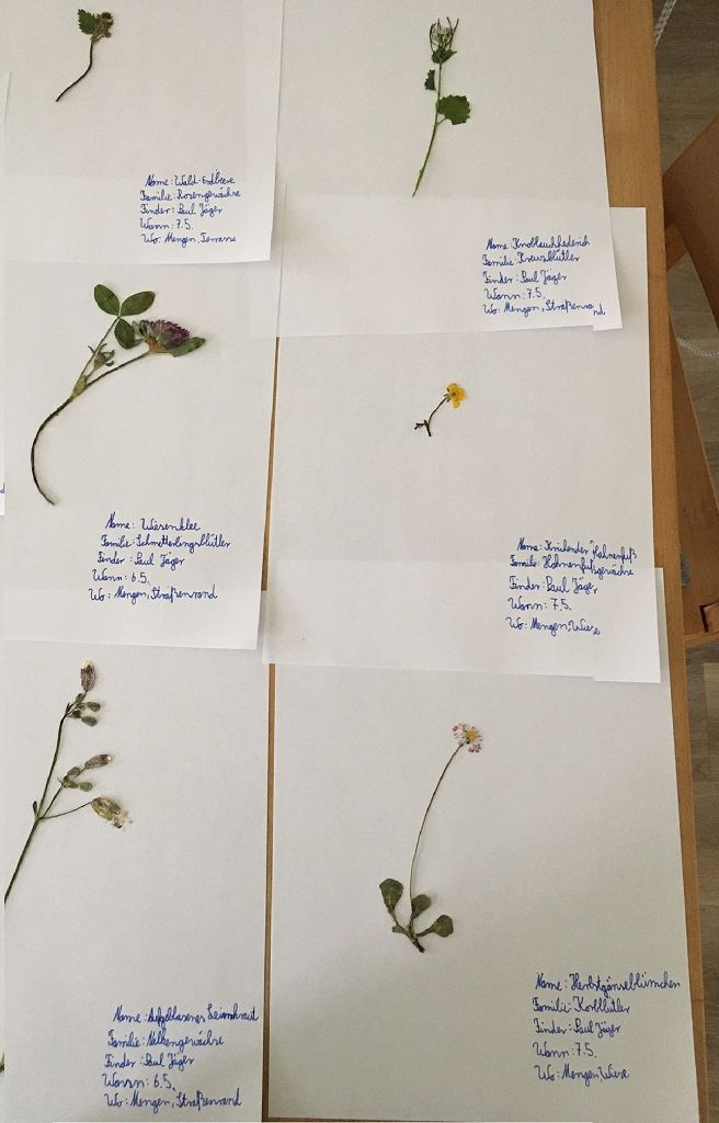 Damit das wissenschaftliche Arbeiten auch im Fernunterricht nicht zu kurz kommt, machten sich die Schüler der Klasse 5b auf die Suche nach echten Blütenpflanzen, um diese mit Hilfe eines Bestimmungsschlüssels und einer App den richtigen Familien zuzuordnen und daraus ihr eigenes Herbar(ium) zu erstellen, eine Sammlung getrockneter Pflanzen.