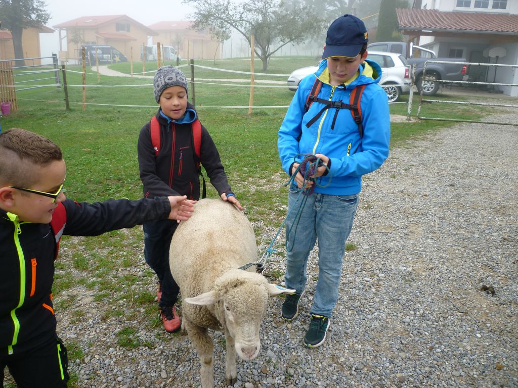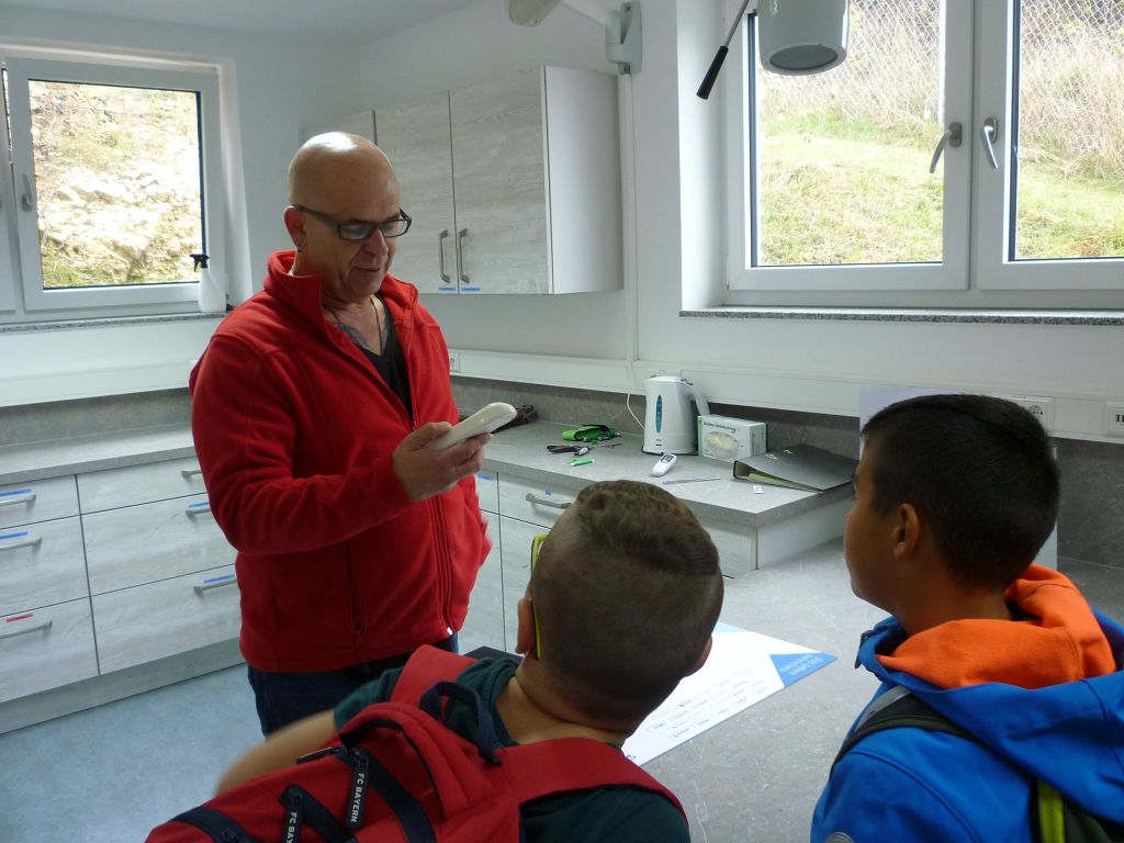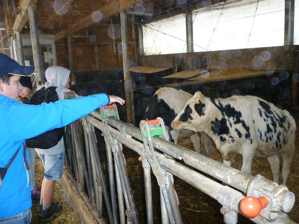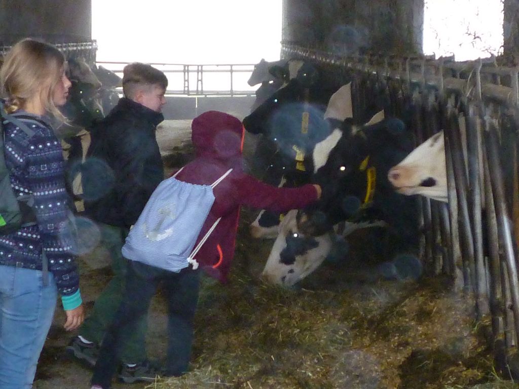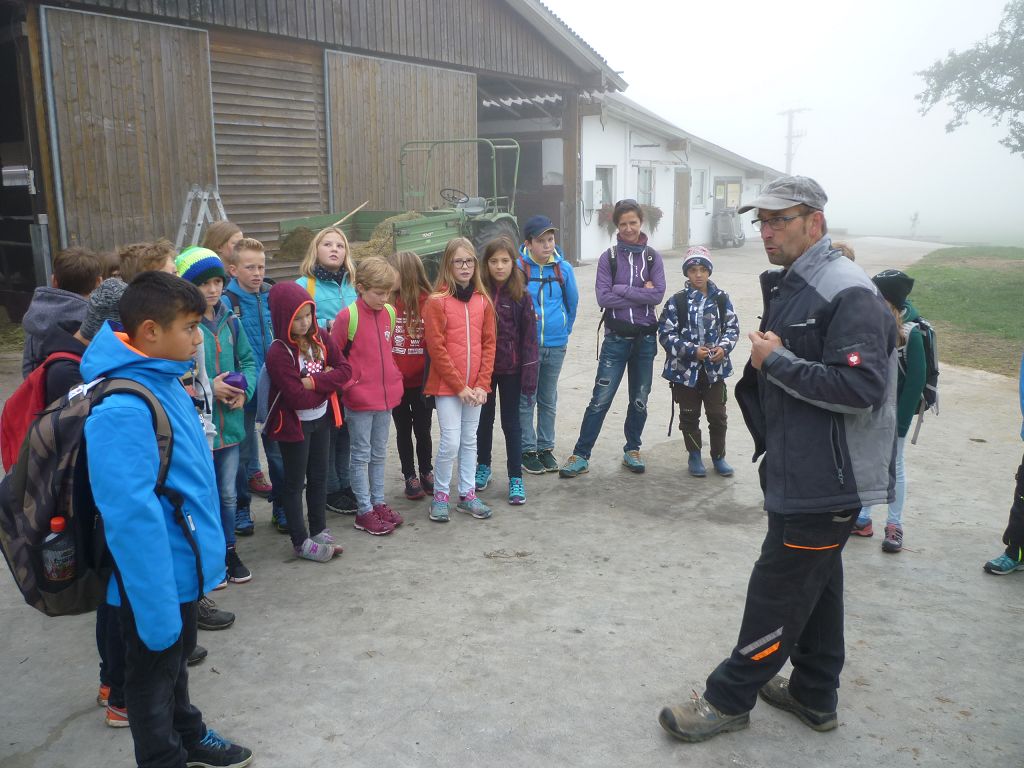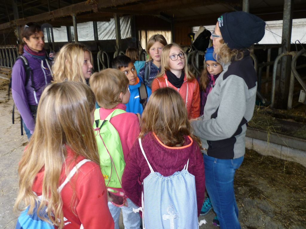 Am Donnerstag wanderten die Kinder der 5b zum nahegelegenen Bauernhof der Familie Neher in Granheim. Ausgerüstet mit Fragen aus dem Biologie-Unterricht bestürmten einige Herrn Neher mit Fragen, während andere sich direkt um die Tiere kümmerten. Herr Neher klärte mit den Kindern, was und wie viel eine Kuh am Tag frisst und die Schüler durften die entsprechende Menge Futter selber abwiegen. Da kam ein ganz schön großer Haufen zusammen! Noch erstaunter waren die Kinder zu hören, wie viele Liter Wasser am Tag jede Kuh braucht.