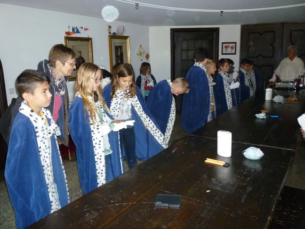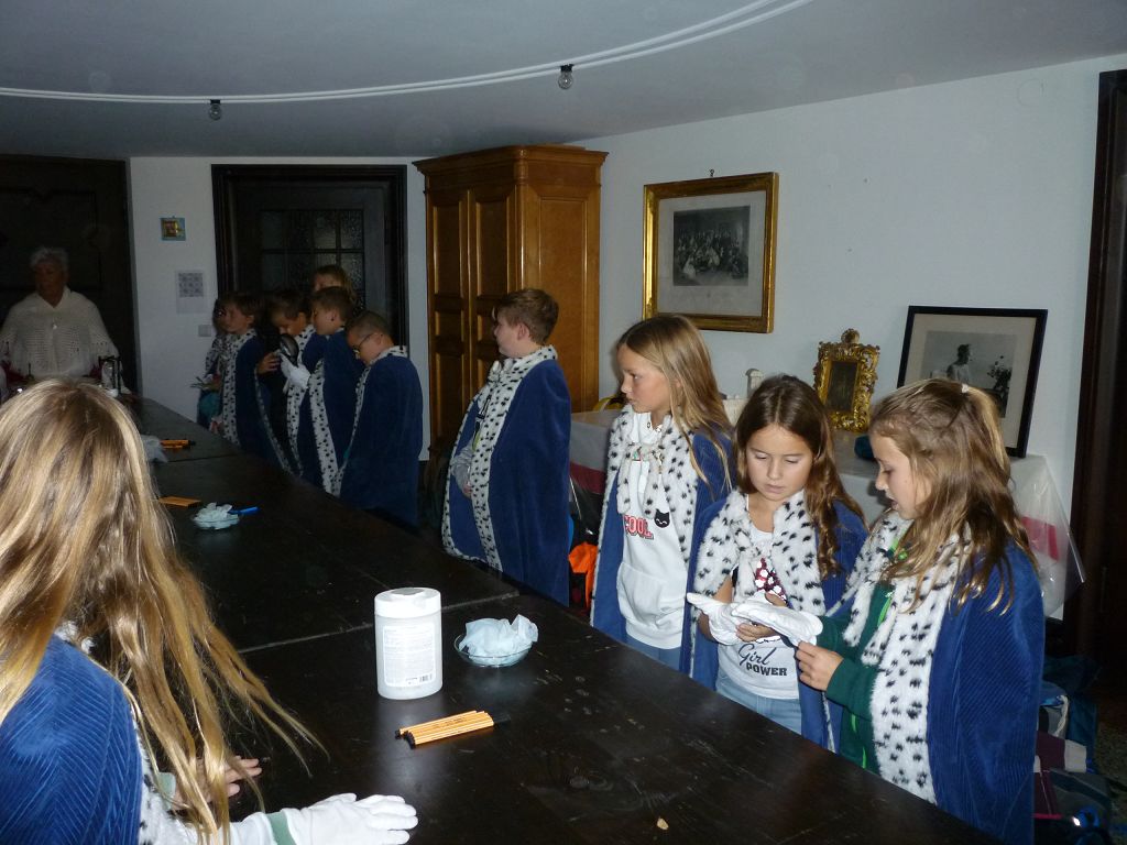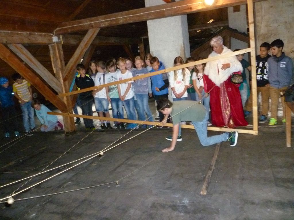 Anschließend marschierten die Kinder zum Schloss Sigmaringen, wo sie bei einer Führung zu Schloss-Detektiven ausgebildet wurden. Zunächst mussten sie dafür im etwas unheimlichen Mäuseturm ihre Geschicklichkeit unter Beweis stellen, indem sie die feinen Schnüre und Glöckchen einer mittelalterlichen Alarmanlage nicht berührten. Nach dem Ausfüllen des Detektiv-Ausweises incl. Daumenabdruck und dem Ablegen des Detektiv-Schwures erzählte ihnen die Hofdame des Schlosses, zu welchem Kriminalfall es gekommen war. Der Schlossherr war im Beisein spanischer Gäste an seiner MIttagstafel vergiftet worden! Sie führte die Kinder an die passenden Stellen des Schlosses und half ihnen dabei, die Hinweise zur Lösung des Falles zu entdecken und zu entschlüsseln.