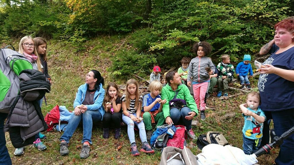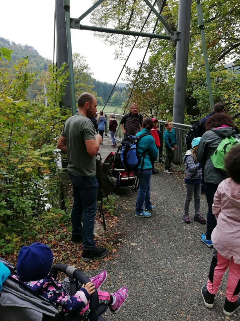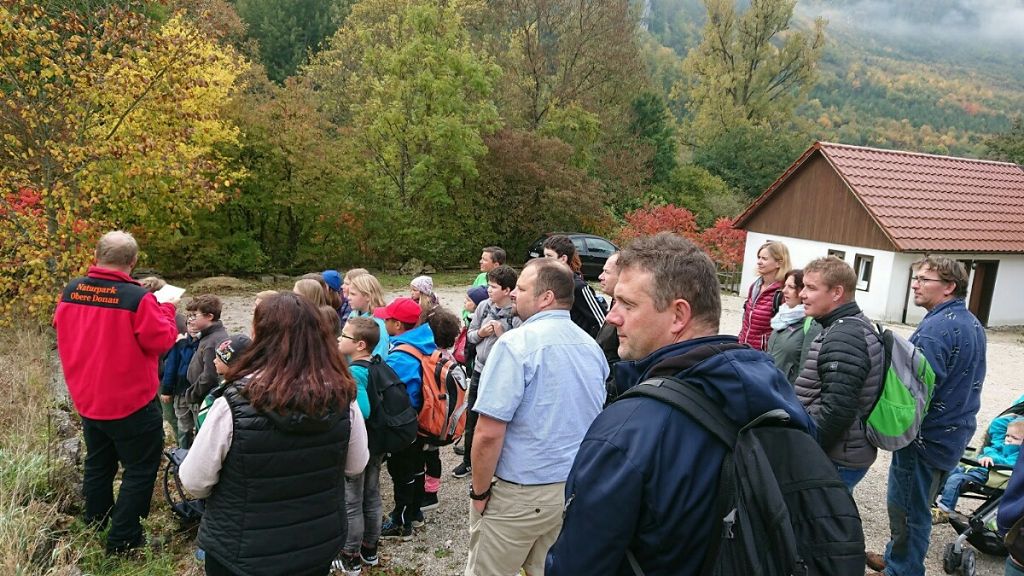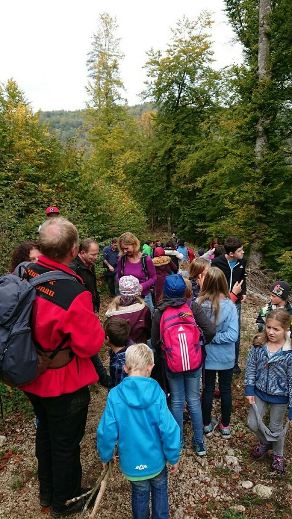 Für den 6.Oktober war wunderbares Wetter angekündigt, und so trafen sich am Vormittag am Mengener Bahnhof zwölf gut gelaunte Familien aus der Klasse 5b, um gemeinsam mit Förster Bernd Schneck vom Haus der Natur in Beuron eine Wanderung im schönen Donautal zu unternehmen.