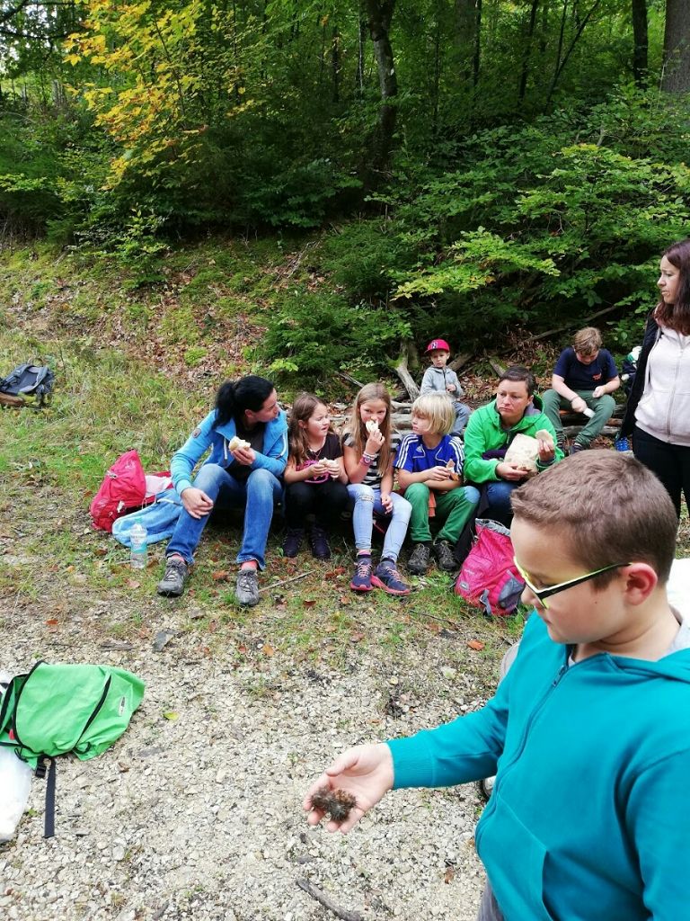 Vor der Tour durften alle Kinder und Eltern die neue Ausstellung im Haus der Natur erkunden. Da gab es viel zu sehen, aber auch anzufassen, zu schnuppern und auszuprobieren. Anschließend führte Herr Schneck seinen fast 50köpfigen Besuchertrupp rund um Beuron, erzählte an verschiedenen Stellen Wissenswertes von den Pflanzen und Tieren des Waldes und zeigte den Kindern sogar eine Stelle mit fossilen Gesteinen. Einige der Kinder fanden tolle Abdrücke von Tieren. Das Spiel im Wald, bei dem die Kinder in zwei Gruppen gegeneinander antraten und kleine Aufgaben lösen mussten, machte allen viel Spaß. Als es nach der Wanderung im Café Härtel noch ein Stück Kuchen oder ein Eis für jeden gab, war das der perfekte Abschluss für einen schönen Ausflug in der Natur - und zum Kennenlernen der neuen Mitschüler und ihrer Familien.