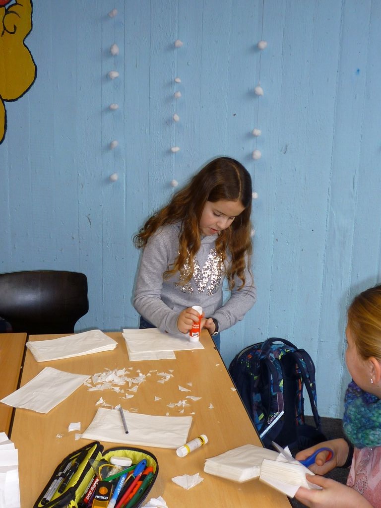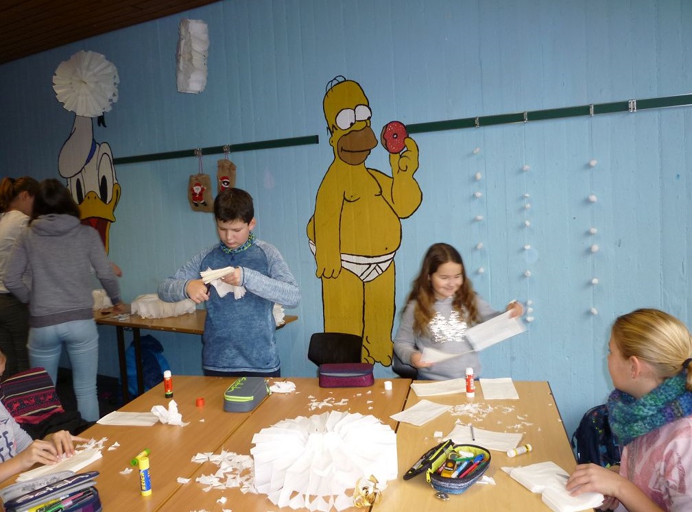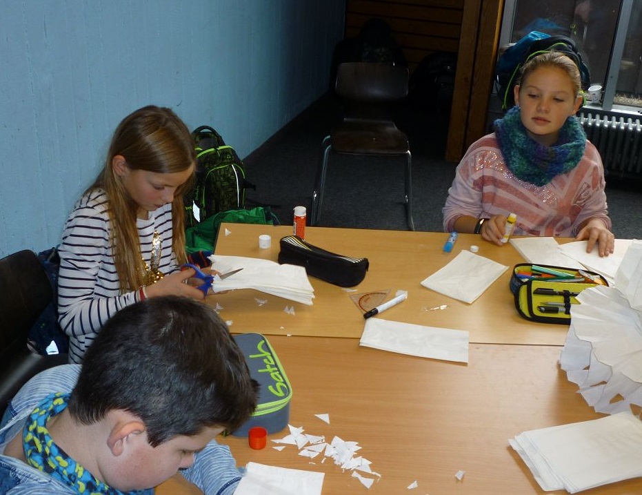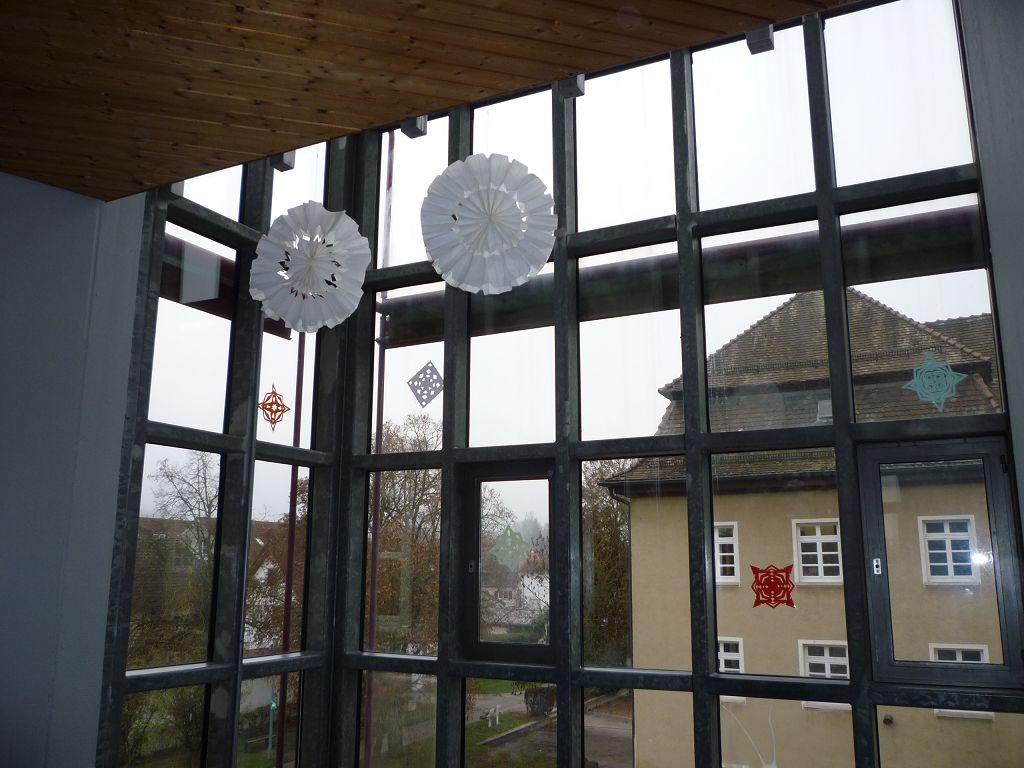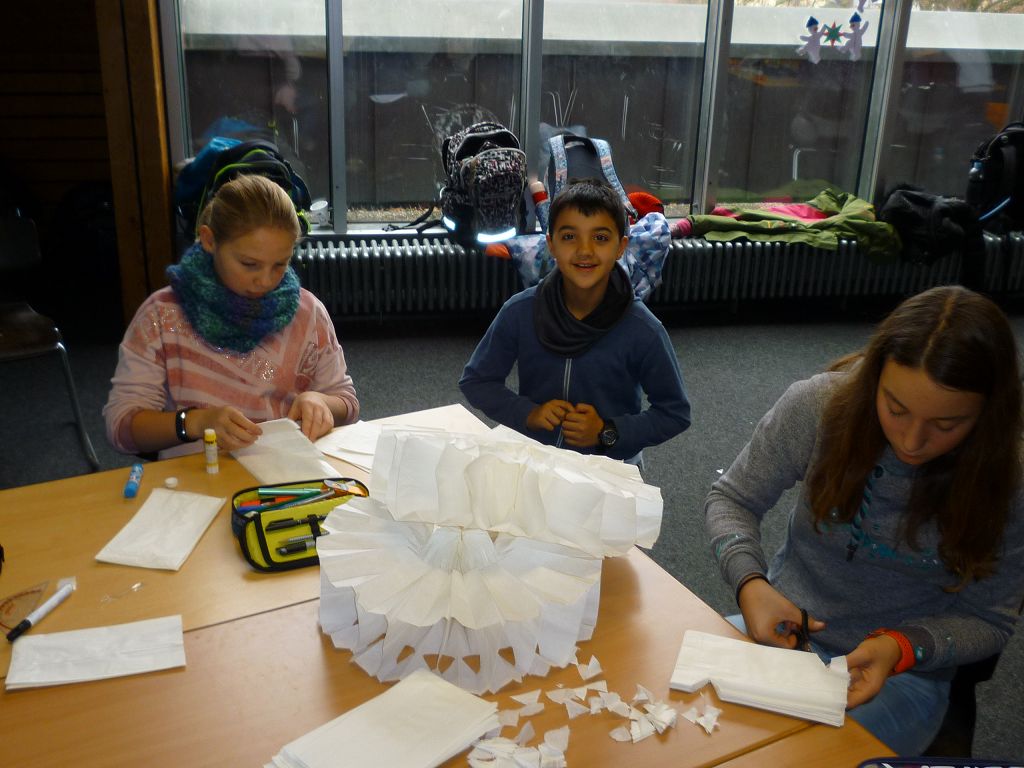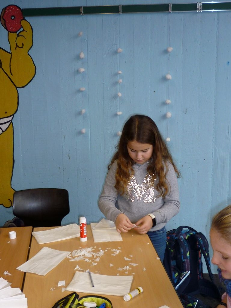 aneinander geklebte Vespertüten aus Papier. An einer anderen Station konnte man Wattebäusche auf eine lange Schnur auffädeln. In regelmäßigen Abständen verknotet und mehrere Schnüre nebeneinander gehängt, sieht es fast so aus, als würde es schneien... Nach zwei Stunden eifriger Arbeit wurden die Schmuckstücke im Klassenzimmer und teilweise auch im Flur und im Treppenhaus aufgehängt.