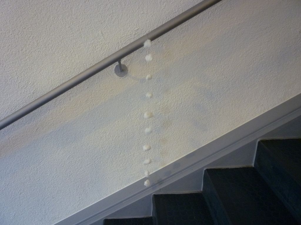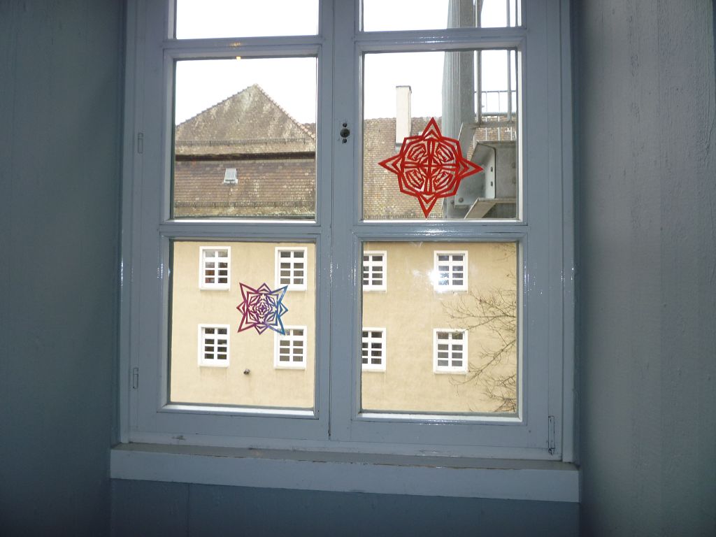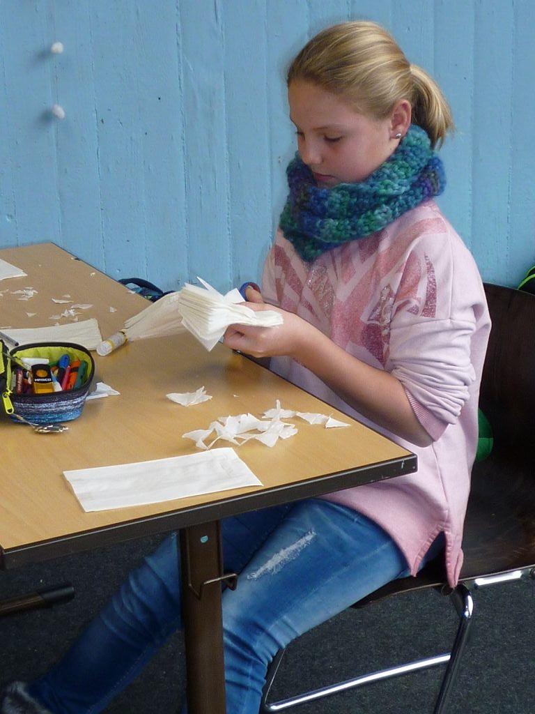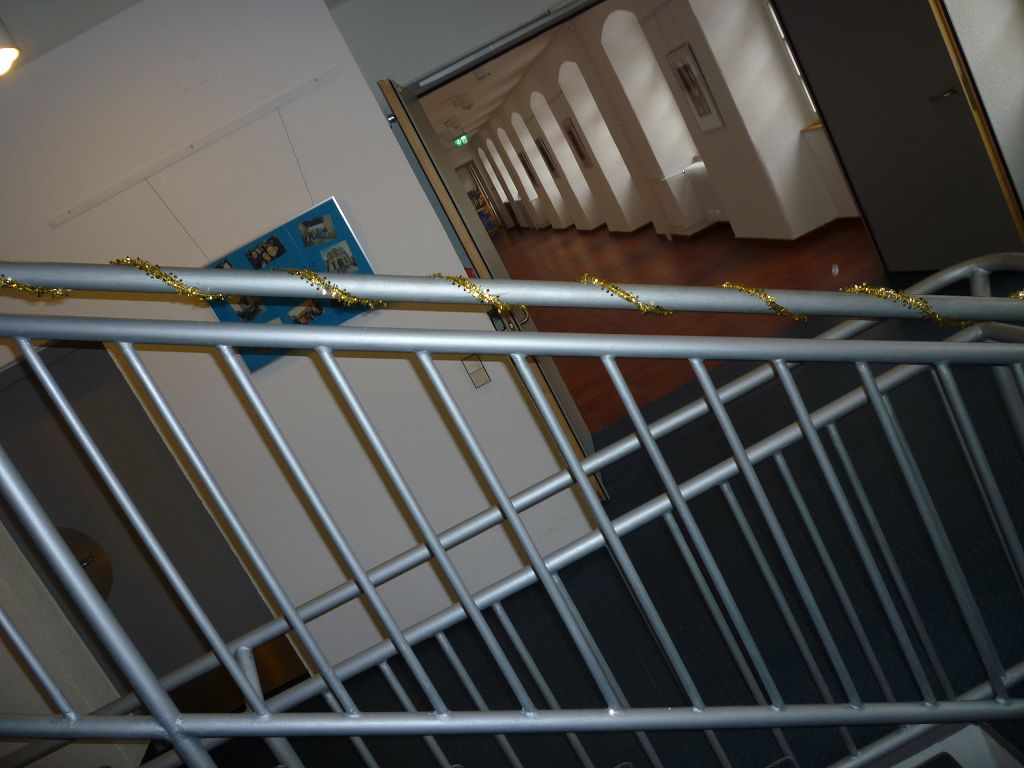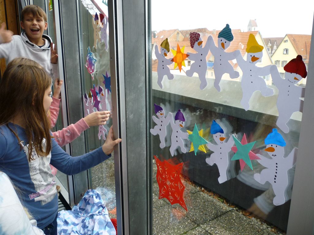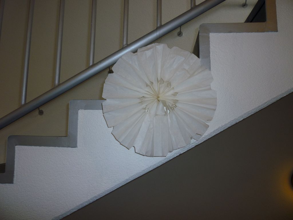 aneinander geklebte Vespertüten aus Papier. An einer anderen Station konnte man Wattebäusche auf eine lange Schnur auffädeln. In regelmäßigen Abständen verknotet und mehrere Schnüre nebeneinander gehängt, sieht es fast so aus, als würde es schneien... Nach zwei Stunden eifriger Arbeit wurden die Schmuckstücke im Klassenzimmer und teilweise auch im Flur und im Treppenhaus aufgehängt.