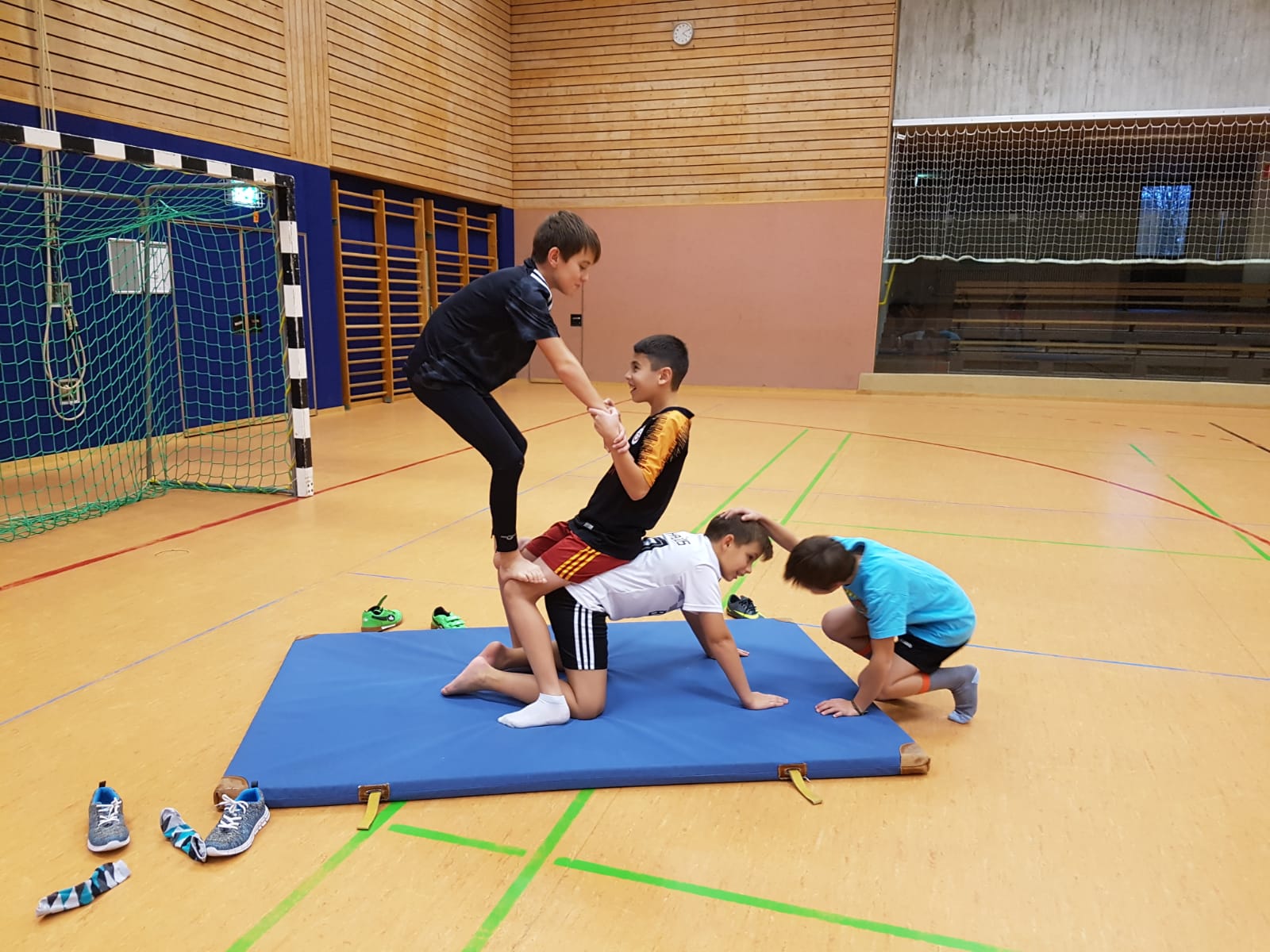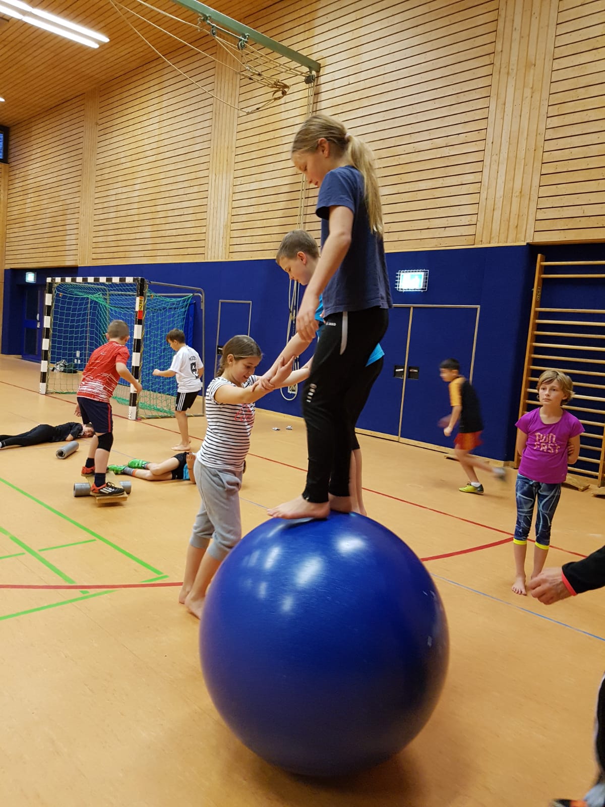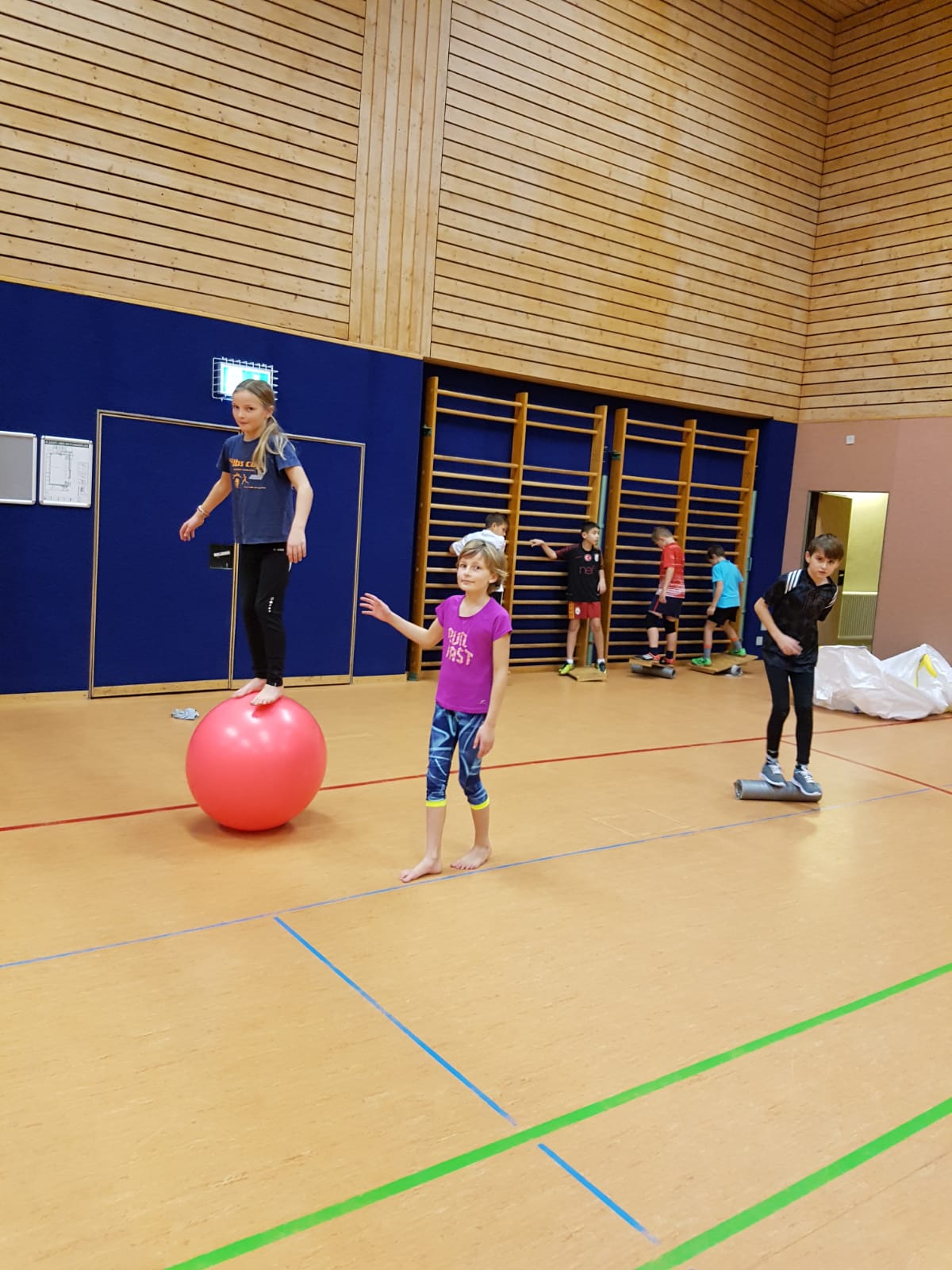 gemeinsam bewältigt. Die Schülerinnen und Schüler lernen, dass es wichtig ist, dem Gegenüber zu vertrauen, damit sie die Spannung halten und so beispielsweise eine Pyramide darstellen können, doch nicht nur das: Sie lernen, wie man jongliert, mit einer Laufkugel läuft oder auf einem rollenden Brett die Balance hält und noch vieles mehr...