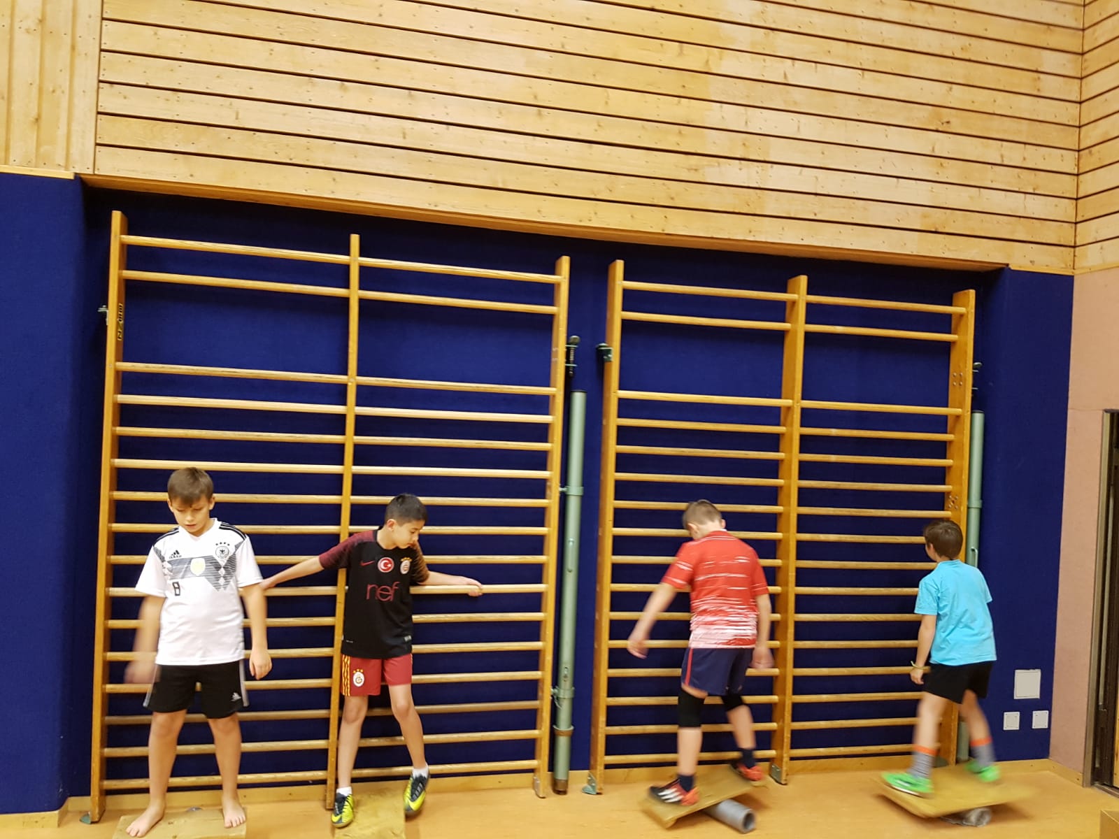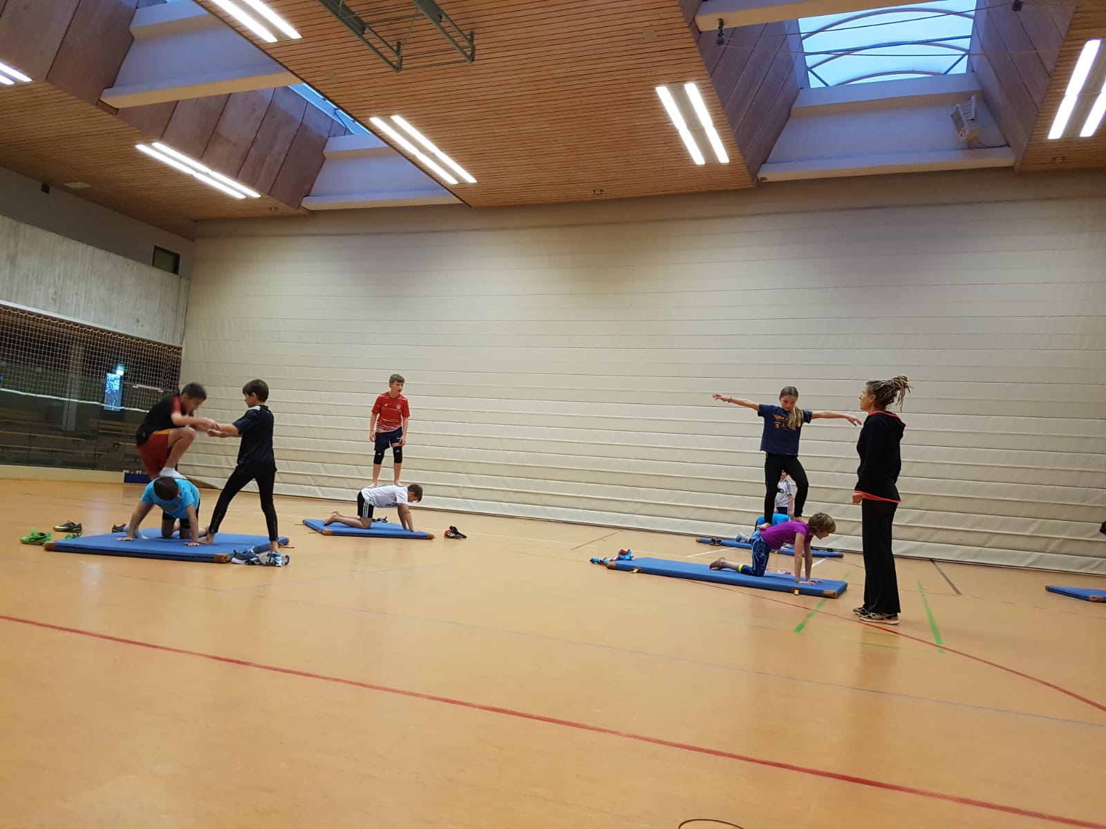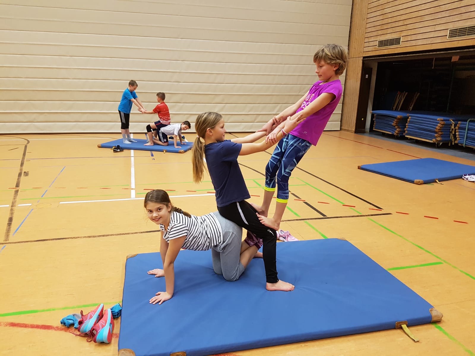 gemeinsam bewältigt. Die Schülerinnen und Schüler lernen, dass es wichtig ist, dem Gegenüber zu vertrauen, damit sie die Spannung halten und so beispielsweise eine Pyramide darstellen können, doch nicht nur das: Sie lernen, wie man jongliert, mit einer Laufkugel läuft oder auf einem rollenden Brett die Balance hält und noch vieles mehr...