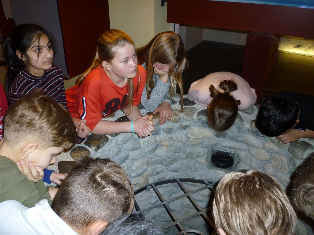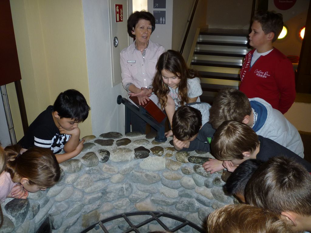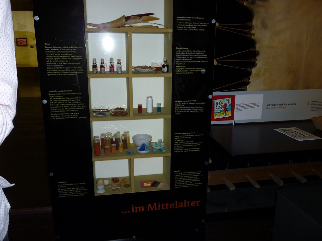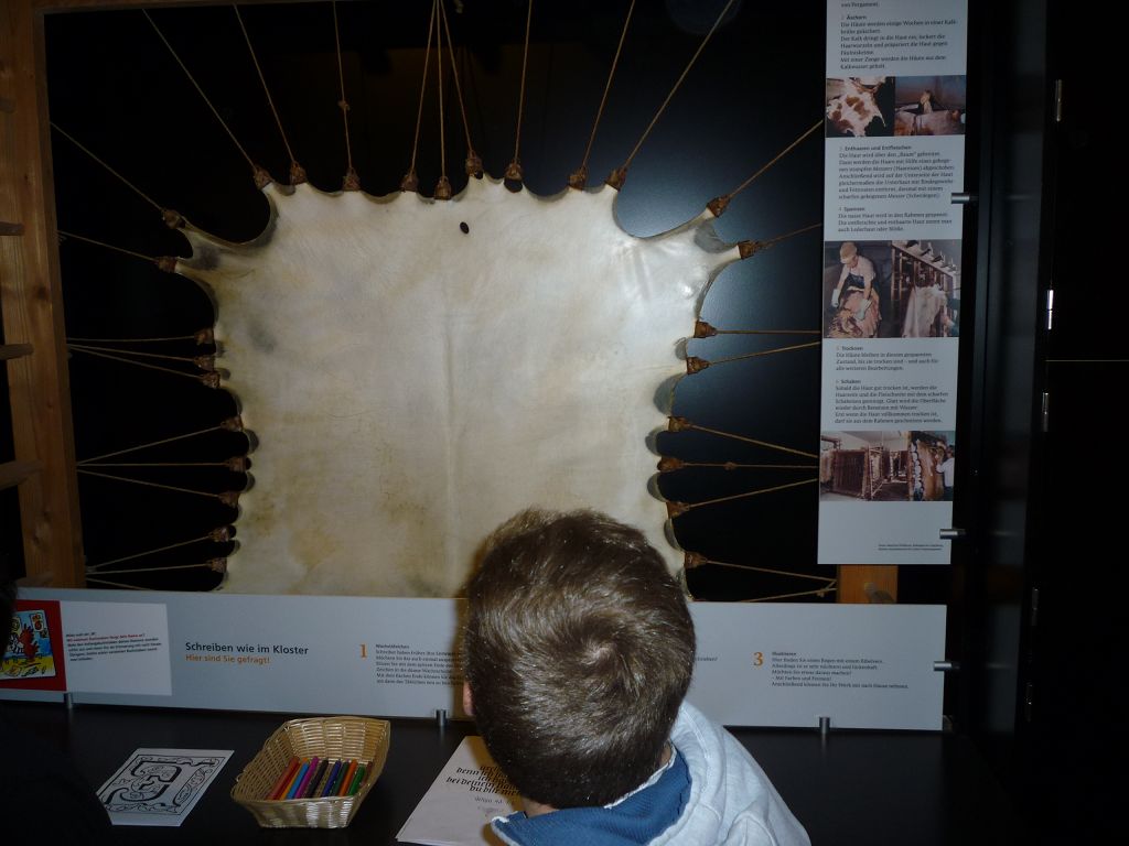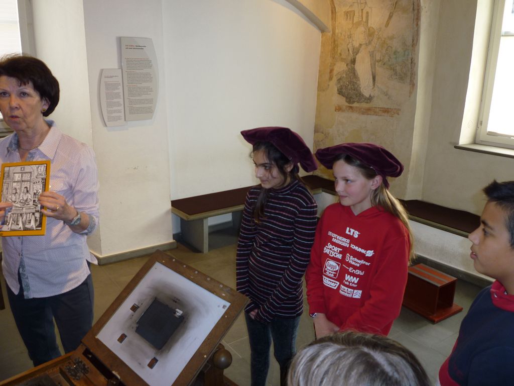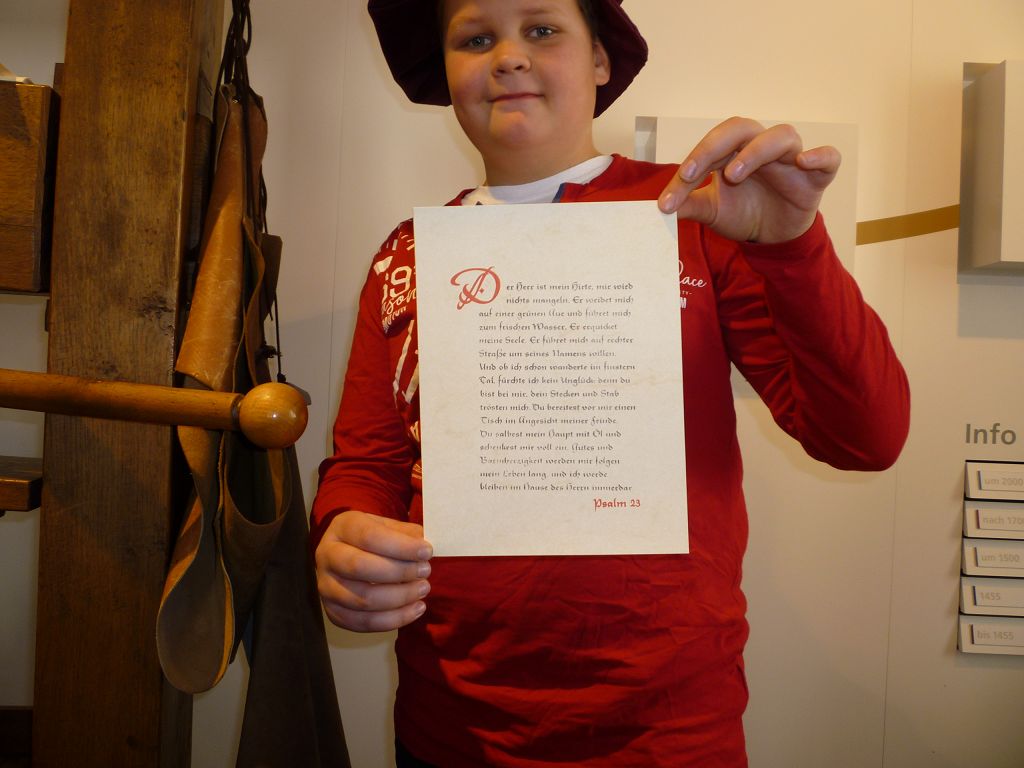 Es gab noch weitere Stationen, die es zu entdecken galt: die kleinste vollständige Bibel der Welt – gerade mal 4 x 4 cm groß! Oder eine Schreibwerkstatt, wo man am meisten die Mäuse fürchtete, die schlimmsten Feinde der Bücher. Um sie am Bücherknabbern zu hindern, besaßen fast alle Bücher seitlich der Buchdeckel eine oder zwei Schließen aus Metall. Das Buch ließ sich am leichtesten öffnen, indem man es auf den Tisch legte und mit der Faust auf den Deckel schlug. So sprang der Bügel der Schließen von allein auf und das Buch klappte auf. Daher kommt die Redewendung „ein Buch aufschlagen“. Und warum betrieb man einen so großen Aufwand? Bücher, die in Klosterwerkstätten in monatelanger Arbeit abgeschrieben wurden, waren sehr wertvoll: ein einziges Buch kostete leicht so viel wie zwei große Bauernhöfe. Das brachte die meisten von uns zum Staunen!