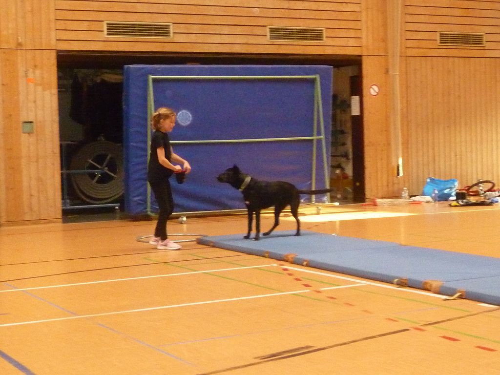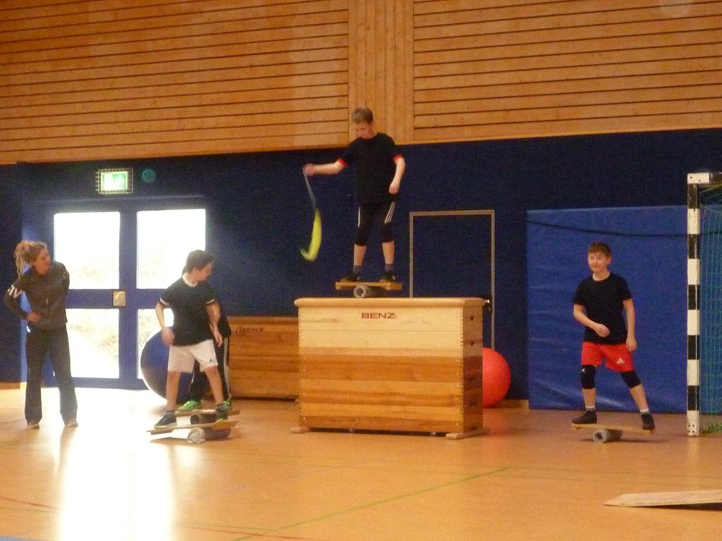 Nach einer kurzen Teambesprechung bauten die Zirkuskünstler Pyramiden auf, zeigten ihre Geschicklichkeit auf den Laufkugeln, beim Jonglieren und auf den Jonglierbrettern namens Rola Bola. Ein Schüler traute sich mit dem Rola Bola sogar auf einen Kasten! Einige Mädchen konnten wunderbar Teller drehen, andere Kinder beherrschten das Einrad oder das Longboard. Stargast des Nachmittags war Vierbeiner Aliso, der auch einige tolle Kunststücke vorzeigte.