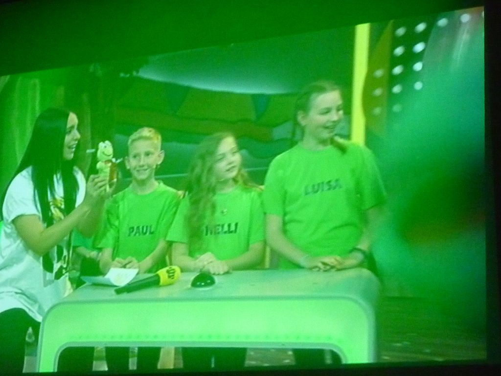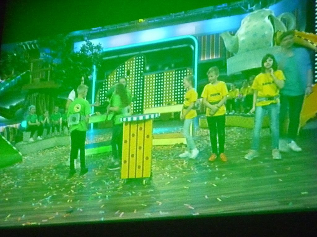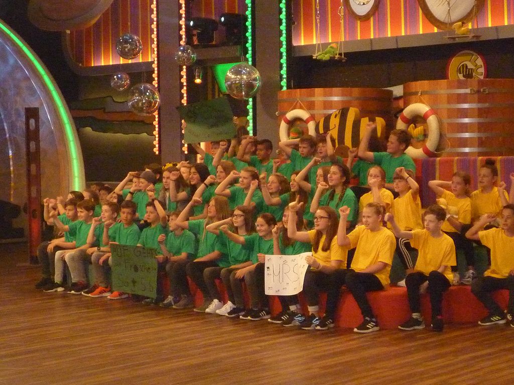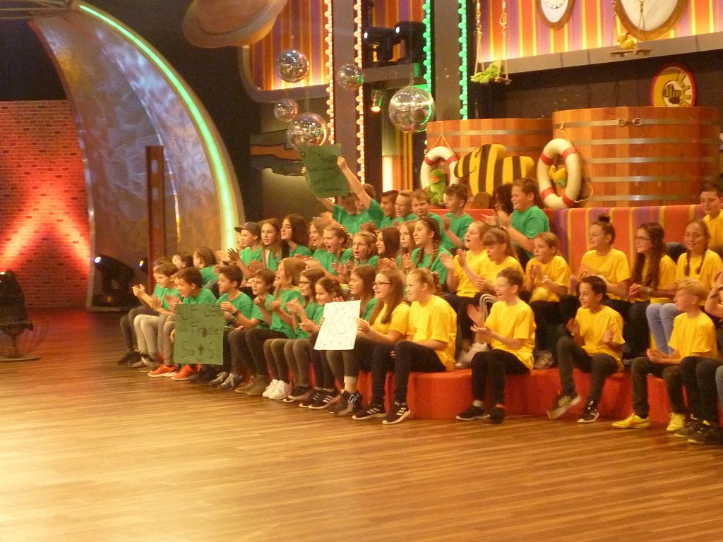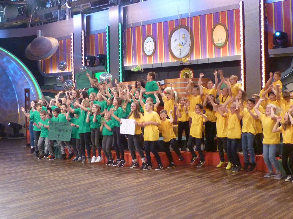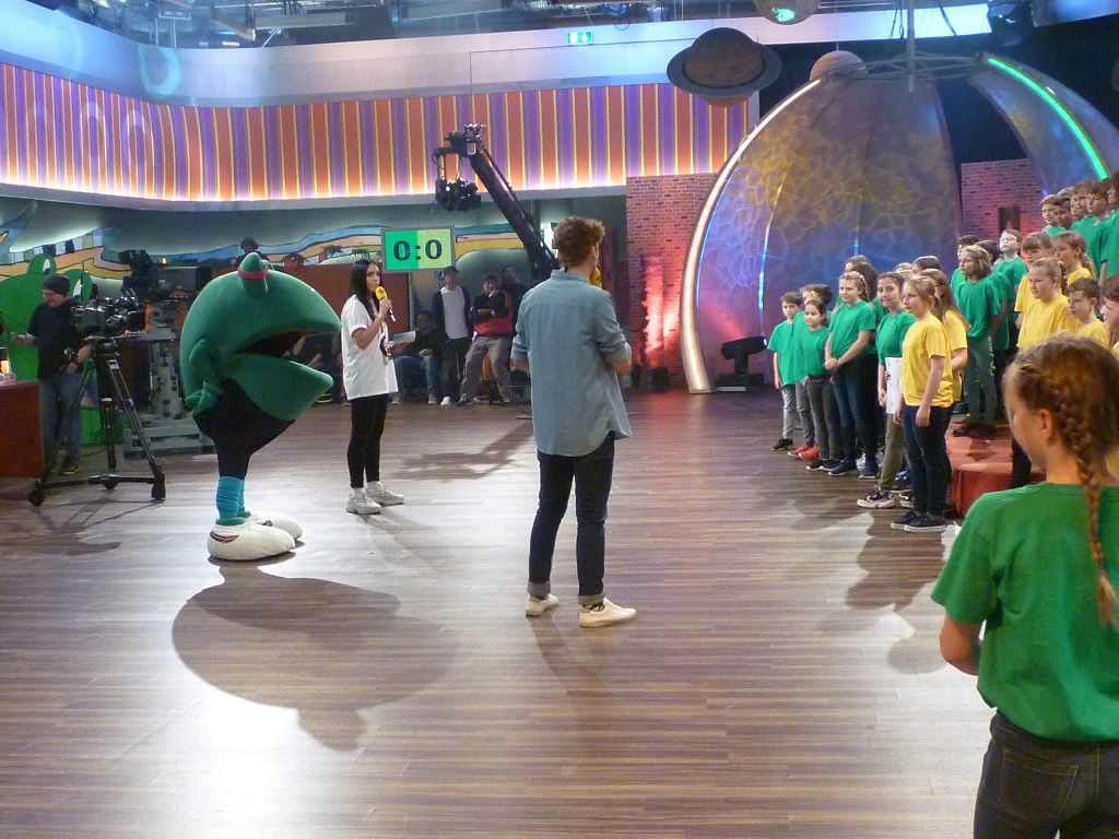 Kurze Zeit später kamen schon vier vom Team des Tigerenten-Clubs. Eine holte direkt die „Spielekinder“ und unseren Lehrer Herrn Krause, der auch im TV zu sehen sein wird, ab. Mit den anderen Dreien sind wir noch eine Zeit lang Seil gesprungen, während unsre kleine Abordnung bereits einen Probedurchgang machte. Endlich wurde es spannend und die Drei haben uns ins Studio zu den Moderatoren Jess und Johannes mitgenommen. Die Spiele begannen und wir hielten uns tapfer gegen unsere Konkurrenz aus Pfalzgrafenweiler in der Nähe von Freudenstadt. Von den prominenten Gästen der Sendung konnten wir noch einige Hip Hop Moves lernen. Vielen Dank an #move2: Katulka, Katja und René!