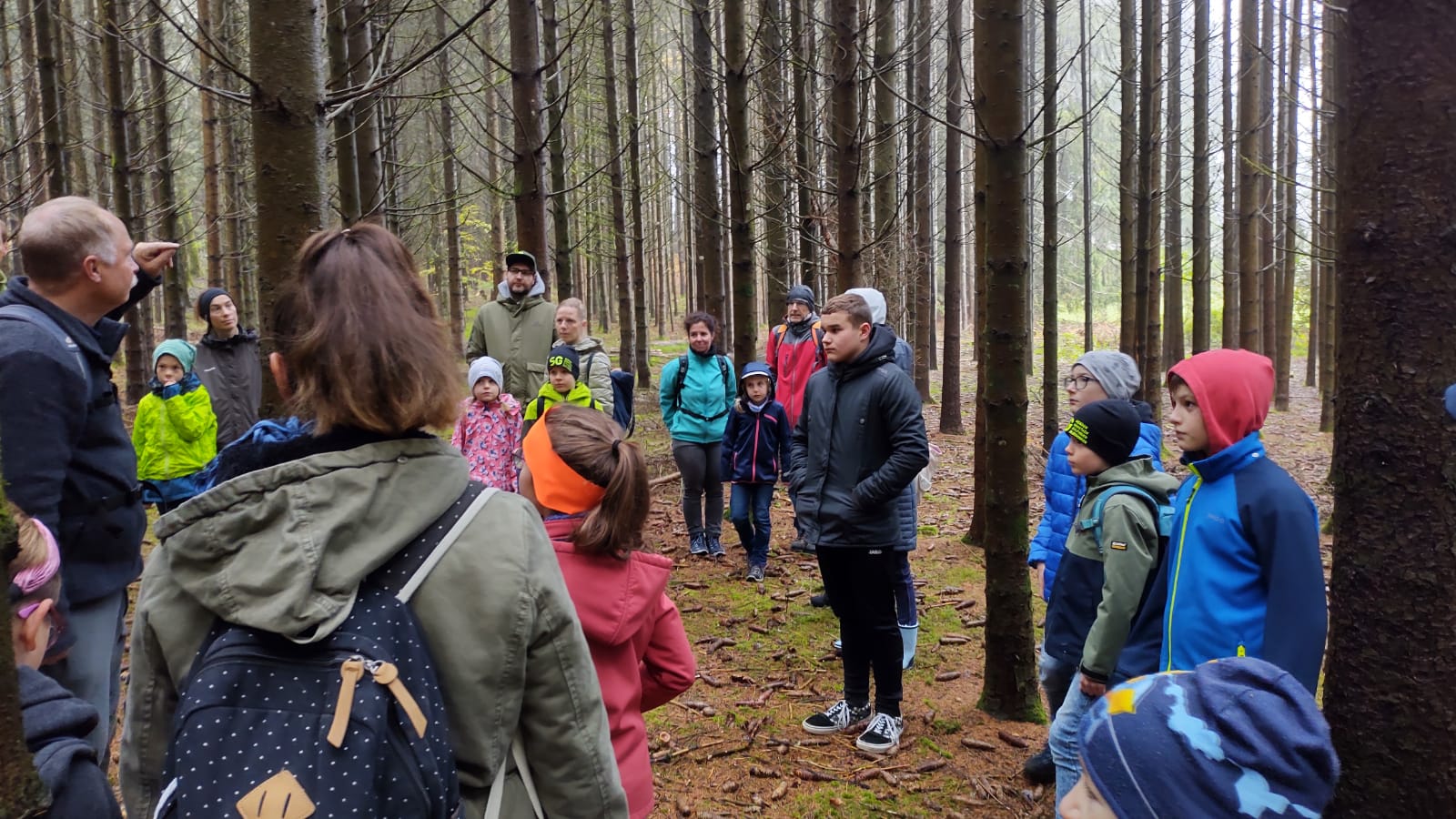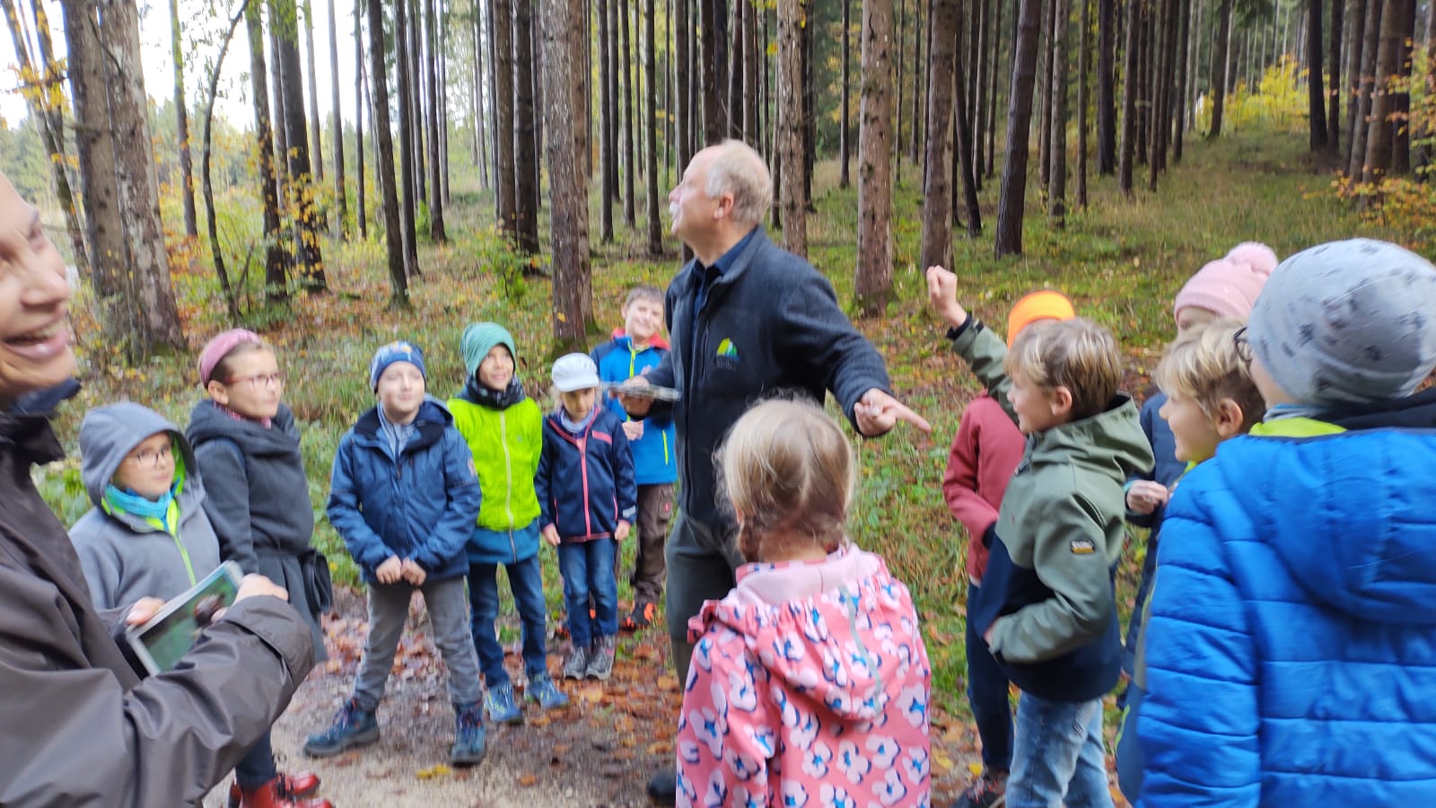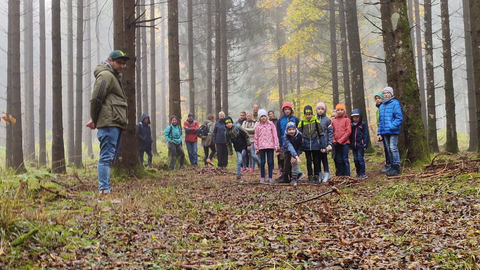 Bei einem weiteren Zwischenstopp teilte uns der Förster in zwei Gruppen ein und wir spielten eine Art Memory. Herr Schneck zeigte uns verschiedene Tiere auf Postkarten und erklärte einiges darüber. Anschließend warf er die Tierkarten in die Luft und immer zwei Kinder mussten seine Aufgabe lösen und die richtigen Tierkarten im Wald finden. Nach dem Spiel spazierten wir zum Parkplatz zurück. Das war ein schöner Tag im Wald