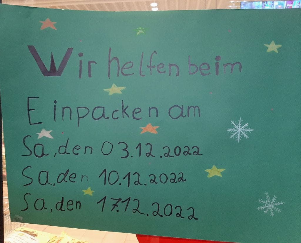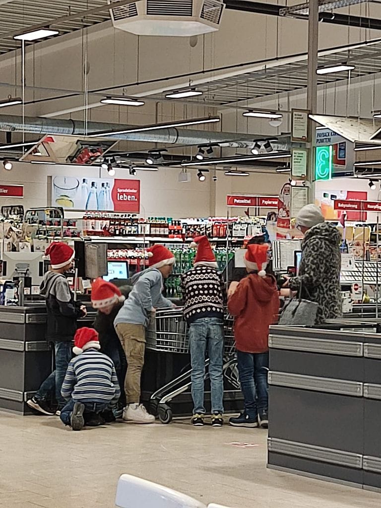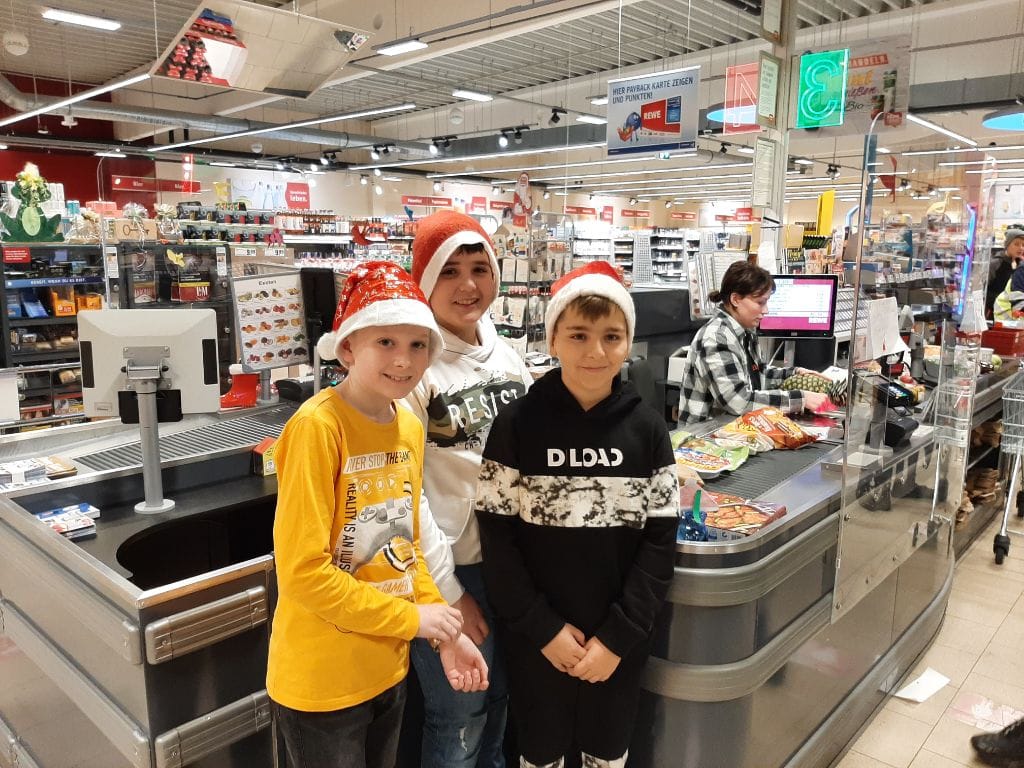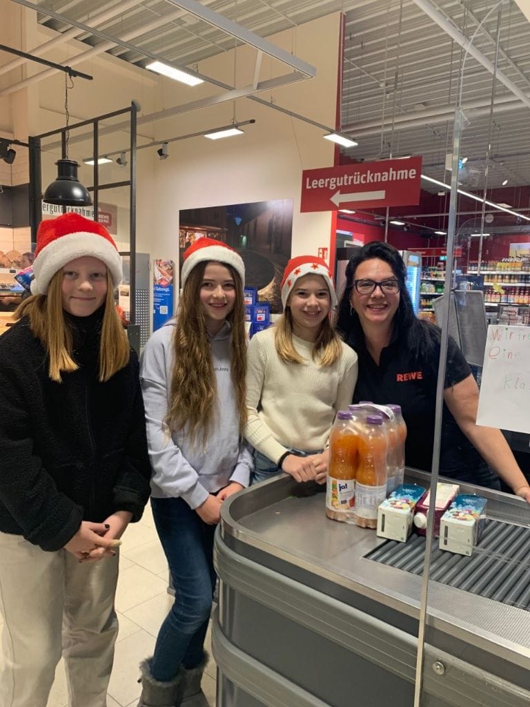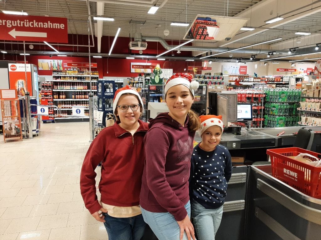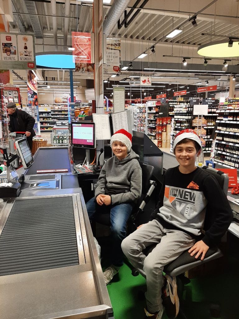 Die Klassen 5a/5b und 6b helfen diese Vorweihnachtszeit vom 03.-17. Dezember samstags wieder im Mengener REWE als Packhelfer.