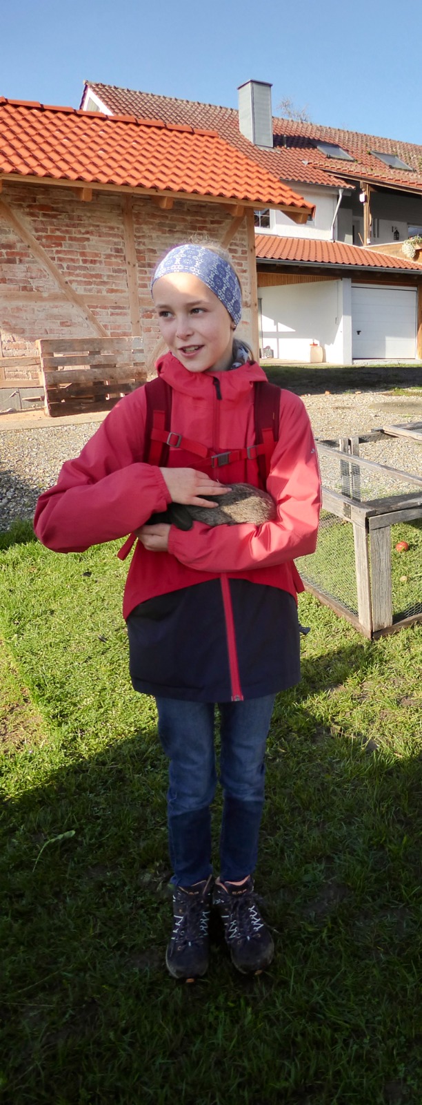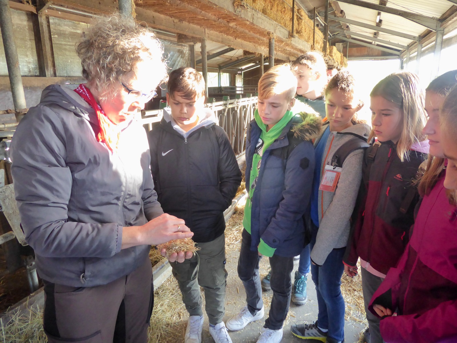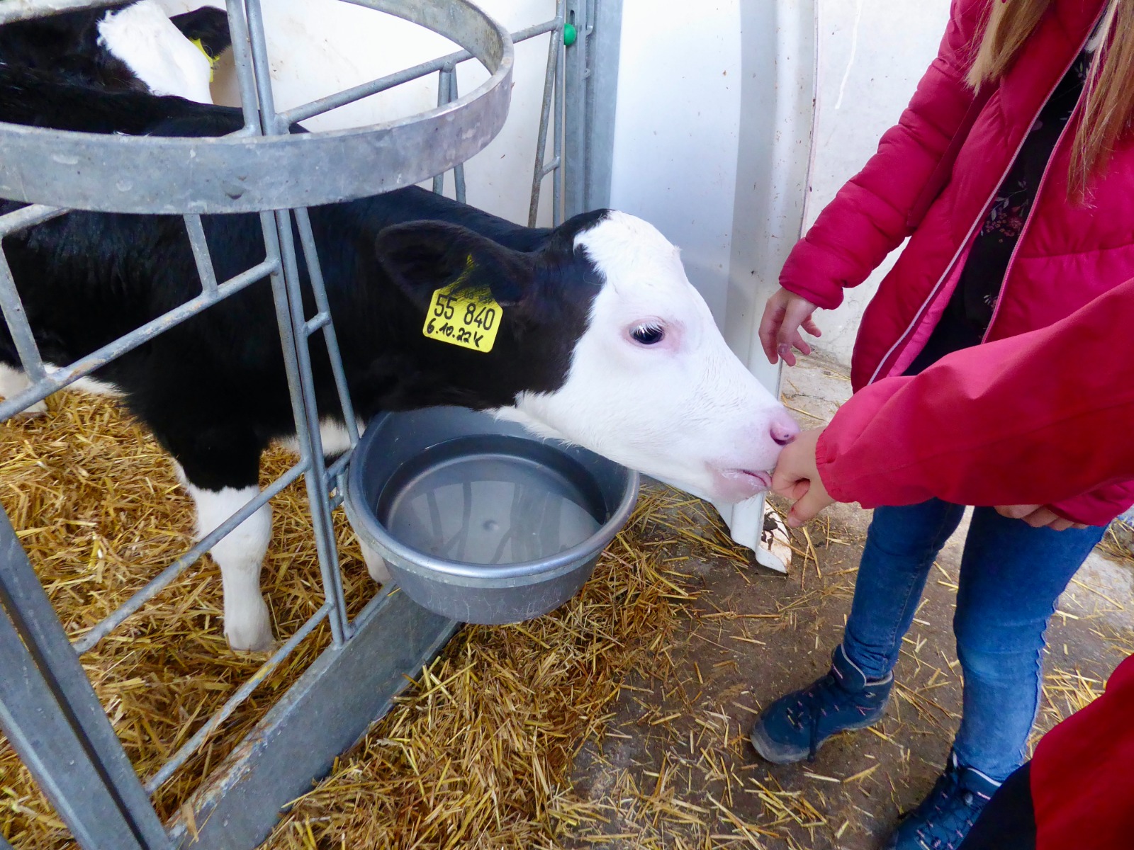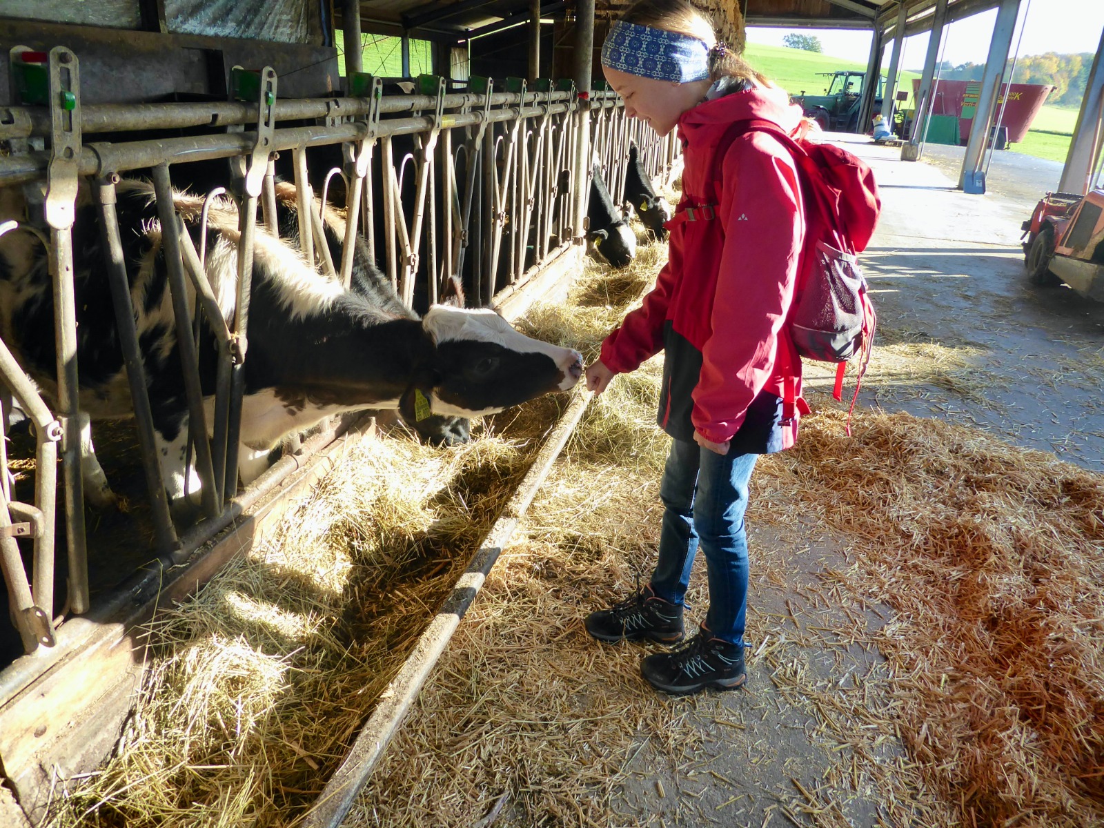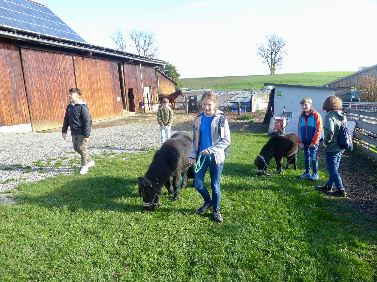 Zuerst haben wir uns um 8.20 Uhr am Fahrradständer mit Fr. Tritschler und Fr. Kacprzak getroffen. Von dort aus sid wir zunächst in Richtung Realschule gelaufen und dann weiter in den Wald Richtung Granheim. Nach einem etwa 30-minütigen Fußmarsch sind wir beim Ferienhof Neher angekommen und haben von der Bäuerin eine Hoftour bekommen. Wir haben die Kühe angeschaut und sie hat uns erklärt, wie die Kühe gemolken werden. Wir durften auch noch eine Woche alte Kälber anschauen und nebenbei haben wir Sahne in einem Glas zu Butter geschüttelt. Als die Butter fertig war, durften wir sie auf leckerem Brot probieren! Danach durften wir uns frei auf dem Hof bewegen und die vielen Tiere ansehen und streicheln, wie z.B. Babyhasen, Seidenhühner, Esel, Ziegen, Katzen, Ponys und Pferde und es gab auch süße Meerschweinchen. In einer großen Scheune waren viele Strohballen zu einer Burg aufgestapelt. An der Decke hing sogar eine Reifenschaukel und es gab eine Kletterwand. Im Hofautomaten konnte man sich mit Eis, Snacks und Getränken verköstigen. Es war ein toller Tag!