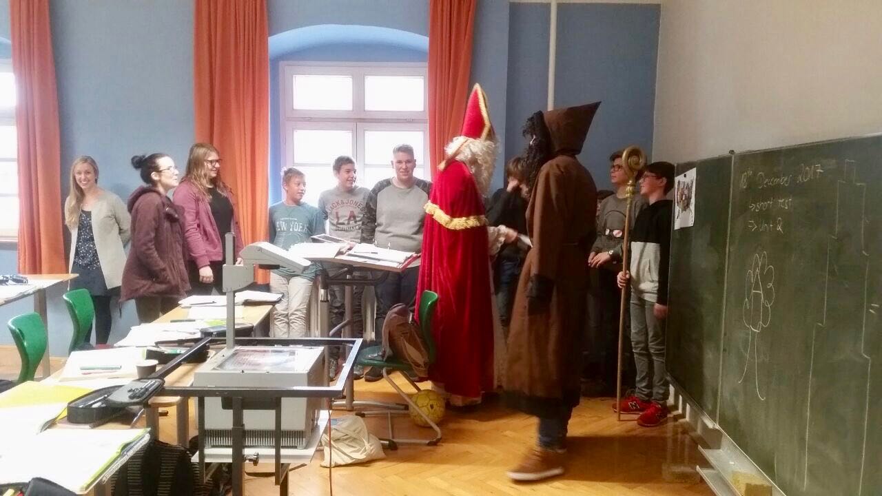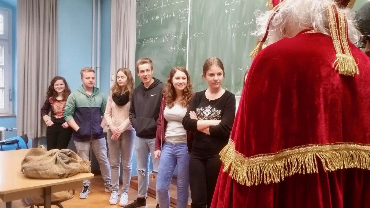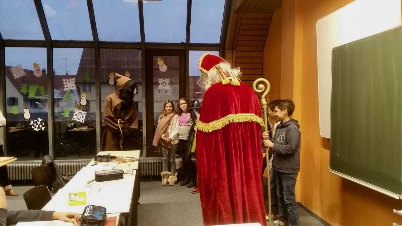 Alle Jahre wieder kommt der Nikolaus ans Gymnasium in Mengen. Zusammen mit seinem Knecht Ruprecht ging er heute durch die Gänge der Schule und schaute bei allen Klassen vorbei. Dort lobte er unter anderem Schüler auf Grund ihres guten Umgangs, gleichzeitig machte er auch auf unangepasstes Verhalten aufmerksam.