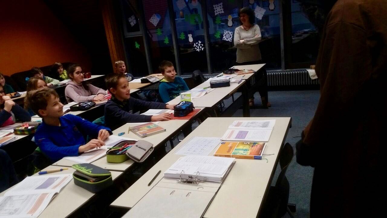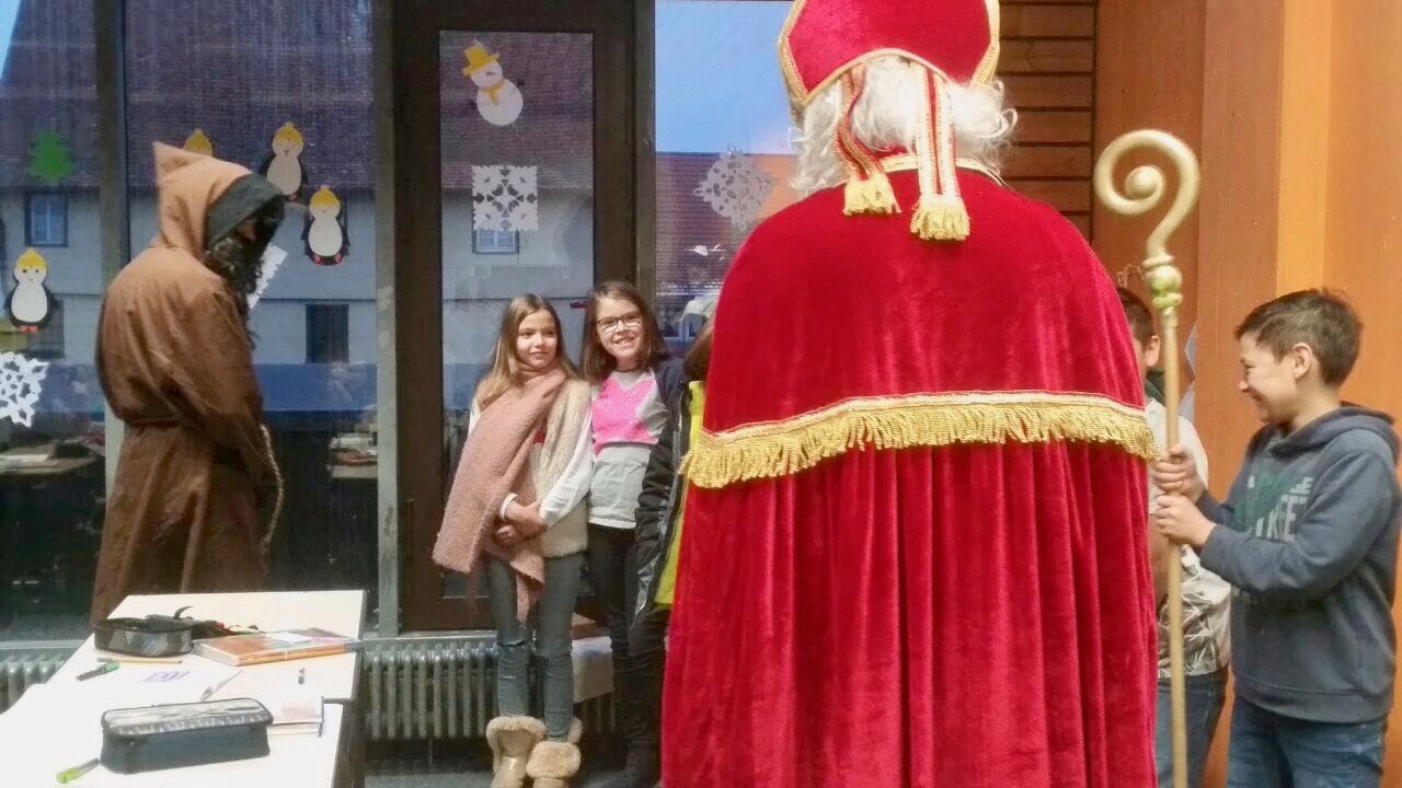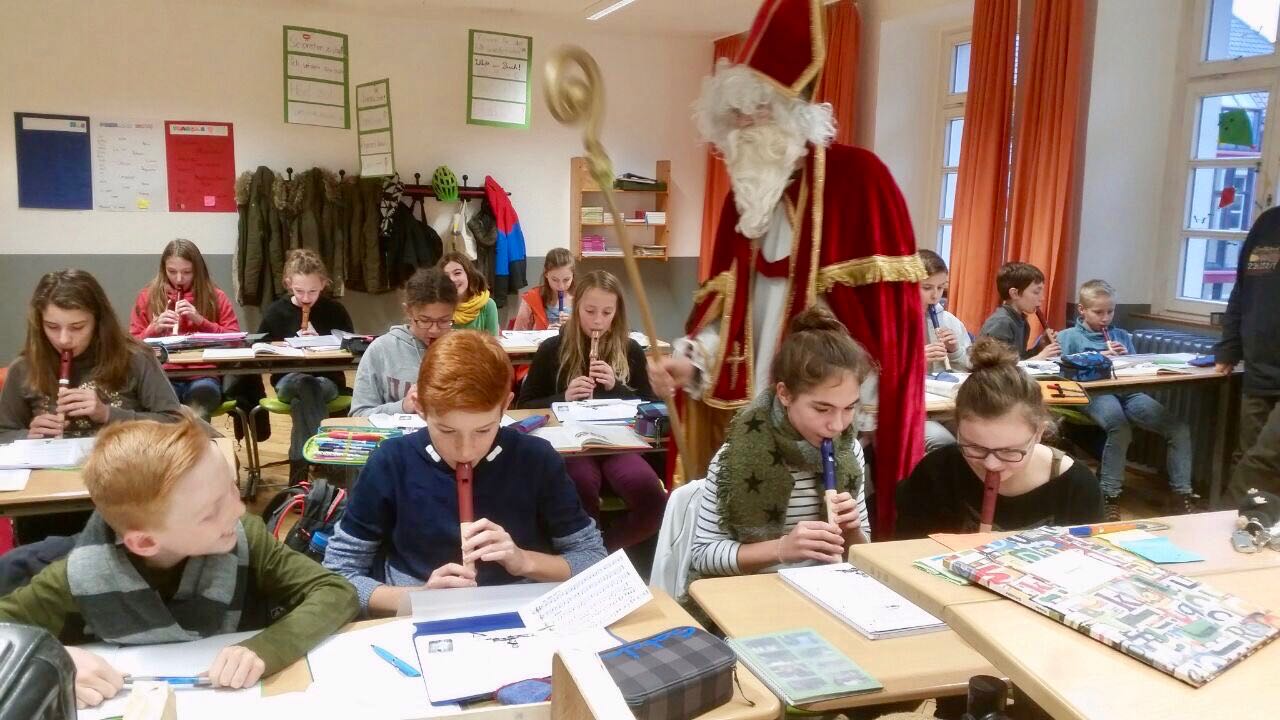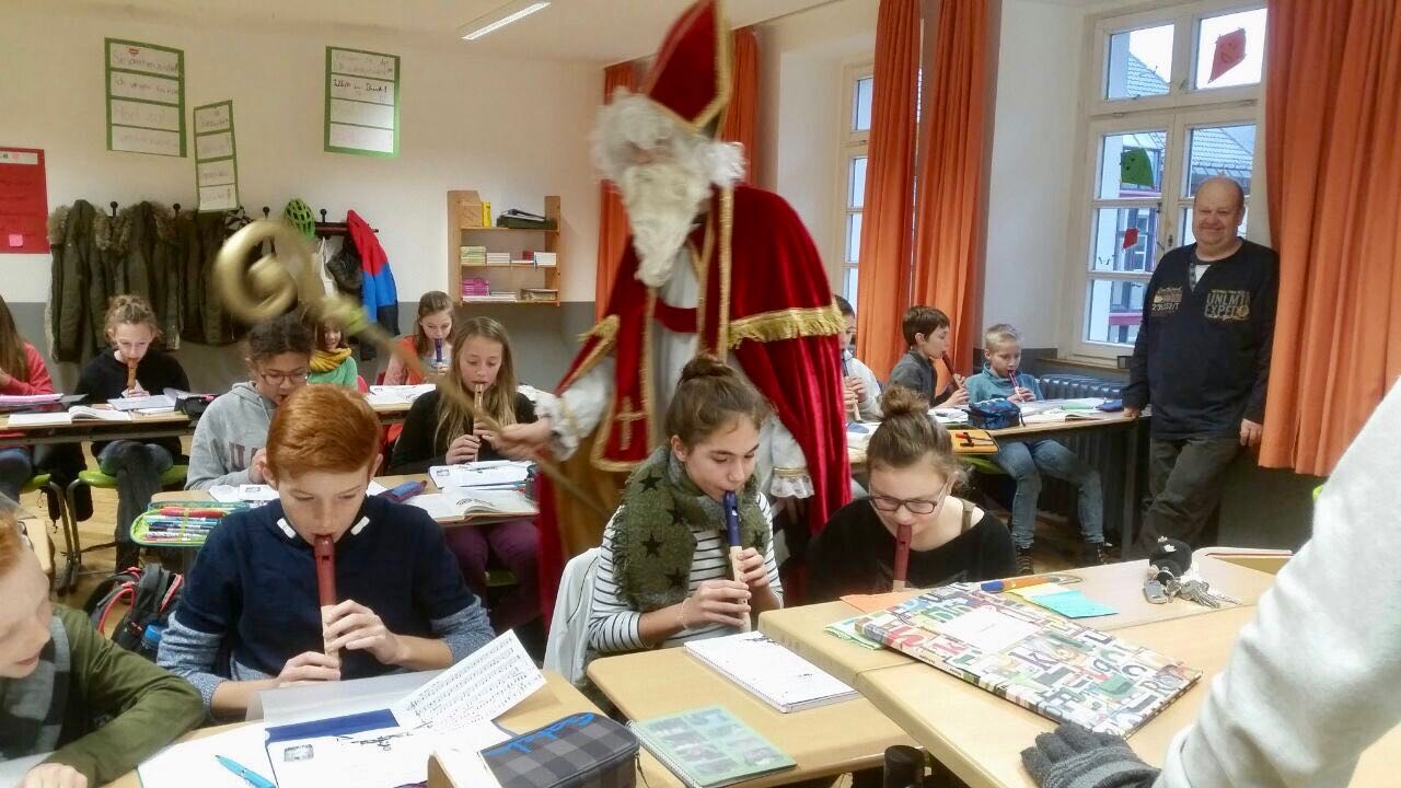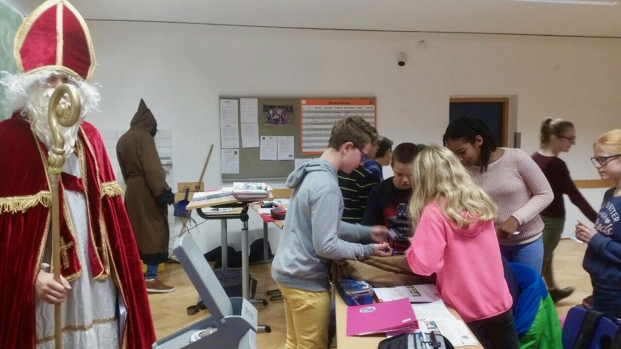 Nachdem die Schüler für den Nikolaus ein Weihnachtslied gesungen oder geflötet hatten, bekamen sie noch etwas aus dem großen Sack, den Knecht Ruprecht bei sich trug. Die Klassensprecher bekamen jeweils einen Schokonikolaus als Dankeschön für ihre Arbeit im Schuljahr.