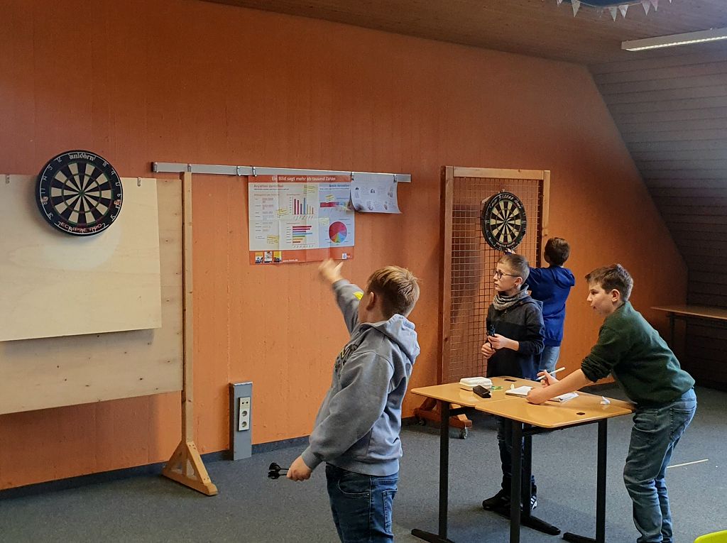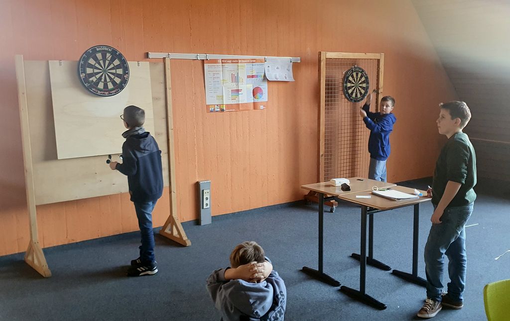 Die Schüler trafen sich mit großer Begeisterung, um ihren Vorbildern nachzueifern und ihre Fähigkeiten im Dartspiel zu zeigen. Im Klassenzimmer 201 duellierten sich vier 2er-Teams bei einer unterhaltsamen Atmosphäre: Team Rulfingen, Team Husky, Team Handymaster und Team Dorfkinder.