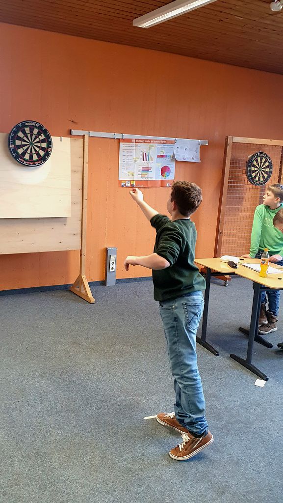 An einer Dartscheibe wurde das Turnier gespielt, eine zweite Scheibe diente als Practice Board. Hier wurden Wurfbewegungen verfeinert und an der Treffgenauigkeit gear-beitet. Es war sehr aufregend und alle Schüler hatten sehr viel Spaß.